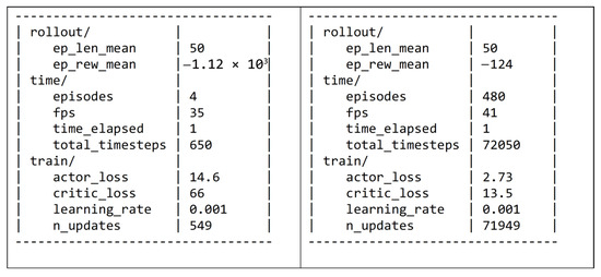 The first example of application of the methodology described above is the evaluation of the health condition of the thrust bearing according to its temperature in one of the four pumps available in the power plant; in particular, CWP 4 was selected as an example. An agent was in charge of learning the relationship between the thrust bearing’s observed temperature and its working condition, which is represented by the temperature of one of the phases of the electrical motor and the discharge pressure of water, both characterizing the work of the pump, and by the power generated by the gas and steam turbines that represent the work demanded of the pump. Following the schema presented in Figure 2, the State observed corresponds to the values of the variables: temperature in one phase of the electrical motor, discharge pressure, and power from gas and steam turbines. The Action is the thrust bearing temperature predicted, and the Environment estimates a reward according to the error obtained and changes the State to a new one. This cycle is repeated in different steps per episode. During this process of learning, the agent is expected to collect better and better reward values. Figure 3 presents two instances of the learning process. The left column of the table corresponds to the beginning of the learning process (episode 4), where the mean reward at that moment was −308 (variable ep_rew_mean) and the losses in the actor and critic neural networks were 3.63 and 69, respectively. After 480 episodes (see right column of the table), the reward was improved to a value of −123, and the distance in losses between the two neural networks was closer than before; these facts demonstrate that the model is learning. The training time for this example was 18 min on a computer with an Intel(R) Core(TM) (Santa Clara, CA, USA) i7-4790 CPU @ 3.60 GHz 3.60 GHz, RAM: 8.00 GB, and Windows 11 Enterprise OS (Redmond, WA, USA).