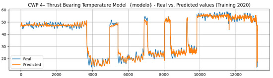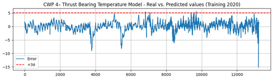 Even when the error is small, it has to be considered to reduce the possible number of false alarms if it is to be used for detecting an abnormal temperature in the pump’s thrust bearing. For this purpose, an upper confidence band for the error is defined covering 3 times the standard deviation observed for the training error, and is shown in Figure 7. A lower confidence band is not considered because it does not affect the possible failure mode due to abnormally high temperature. If three consecutive points are outside the upper band, this is considered to be a possible anomaly in the behavior expected. Figure 7 presents only a few non-representative points outside the confidence band, indicating good representation of normal values for the thrust bearing temperature during 2020 for CWP 4.