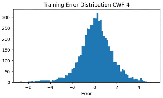 The mean value of the error obtained is −0.10 °C, with a standard deviation of 1.65 and RMSE value of 0.825. Figure 6 presents a histogram of the training error distribution that is centered around 0, a fact that agrees with the close approximation between the real and predicted values observed in Figure 5.