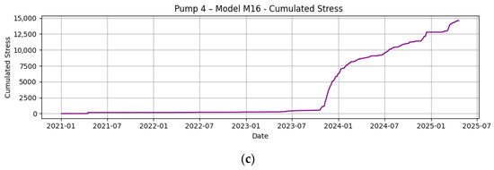 An example can better clarify the impact of the previous assertions about the benefits of failure mode and risk monitoring. Figure 9a–c shows the case of the model, abbreviated as M16, corresponding to the vibration observed in the radial direction on the opposite side of the coupling of the electrical motor to the pump, according to the pressure discharge of CWP 4 and the load generated by the gas and steam turbines. After learning the behavior from 2020 using the TD3 algorithm, as explained before, the new data from the period 2021 to 2025 are passed through the learned model. In Figure 9a, it is observed that the real and predicted values for the vibration studied were as expected until around the end of 2023, but an increasing deviation is observed from this date. This deviation of the error is better observed in the middle of Figure 9b, which also shows the sustained period of time during which the confidence band is exceeded. The cumulative value of the deviations exceeding the confidence band is obtained, which the authors call the “Cumulated Failure Mode Risk,” for which mathematical definitions can be found in references [6,20], also by the authors of this paper. Figure 9c reflects the evolution of this indicator over time. At the beginning of the time period represented, the value 0 indicates that CW4’s health is good due to this failure mode, and that the failure mode risk does not exist. However, this risk increases from the end of 2023 to the last date represented. The most important feature to observe is the slope of the trend because this can signal rapid degradation, which is key information for maintenance and operation crews.