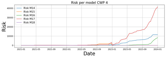Continuing with the case of CWP4 and the risk observed in Figure 9c, it could be questioned whether other vibration measurement points are presenting a similar risk or not. There are five models monitoring vibrations in CWP 4: thrust bearing axial vibration (named M19), radial and axial vibration on the opposite side of the electrical motor coupling to the pump (named M16 and M17, respectively), and radial and axial vibration on the side of the electrical motor (named M14 and M15, respectively). Figure 10 shows the evolution of the respective deviations or risks for all the models mentioned. In this figure, it is observed that there is no risk of the different failure modes monitored in the vibrations until mid-2022, where some small risks are observed in models M17 and M18. Also, during 2023, the other measurement points are affected, with a higher level of vibration with respect to the expected; however, their increase is contained and kept at very stable levels. The only important increasing trend in risk observed corresponds to M17, which is the radial vibration of the bearing on the opposite side of the electrical motor coupling to the pump. This provides important information for the maintenance crew to help them adapt planned maintenance according to the risk curves observed.