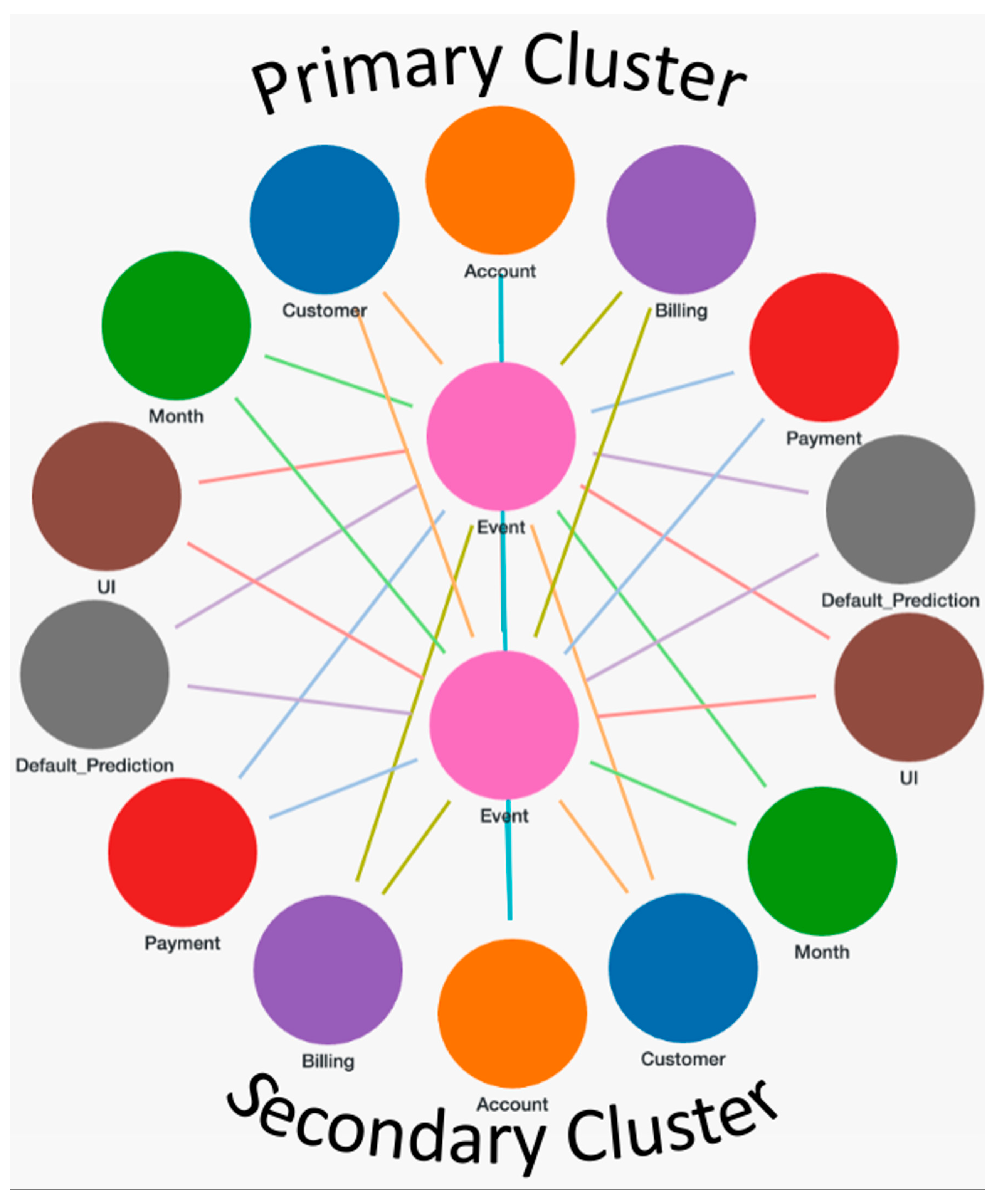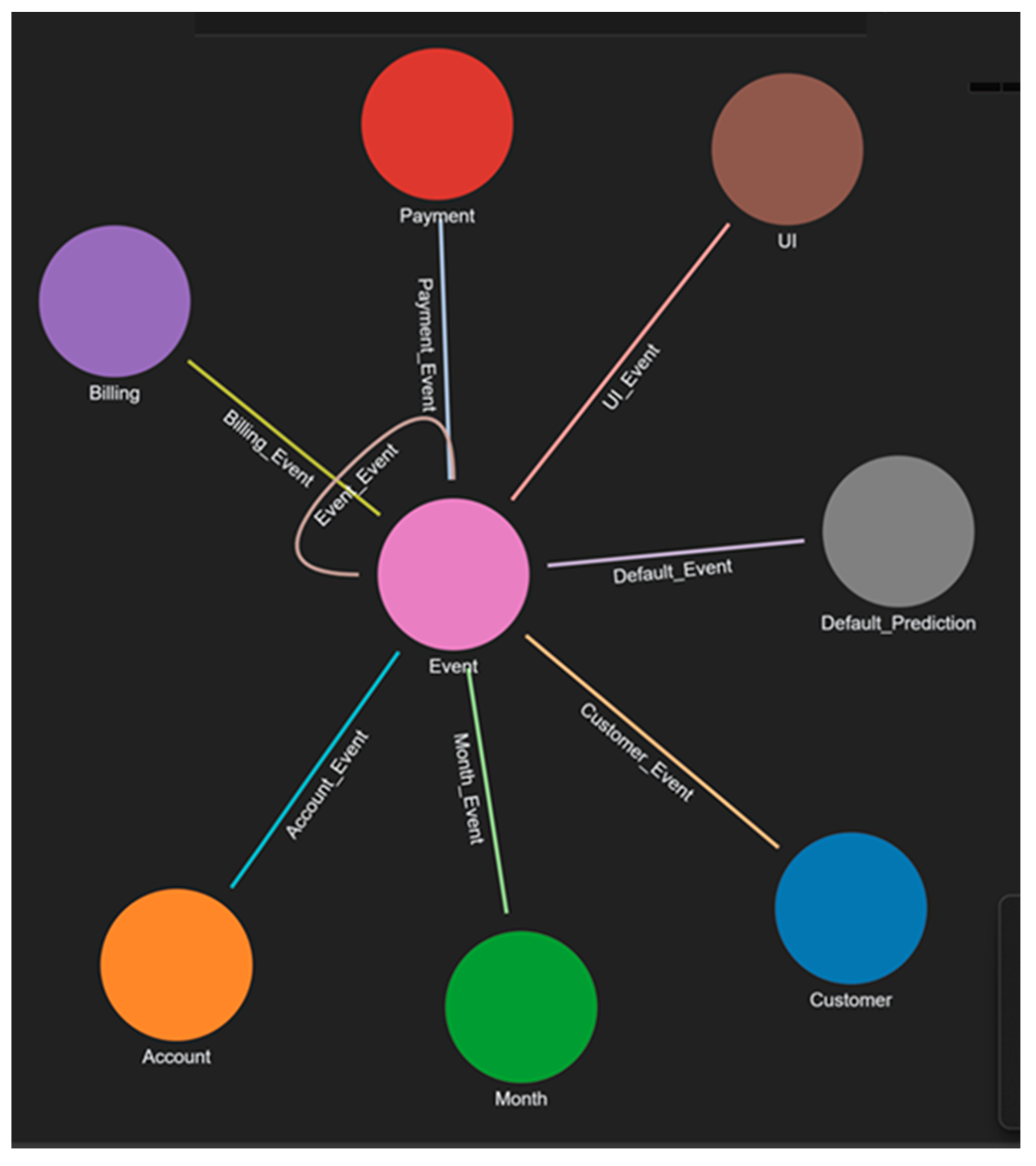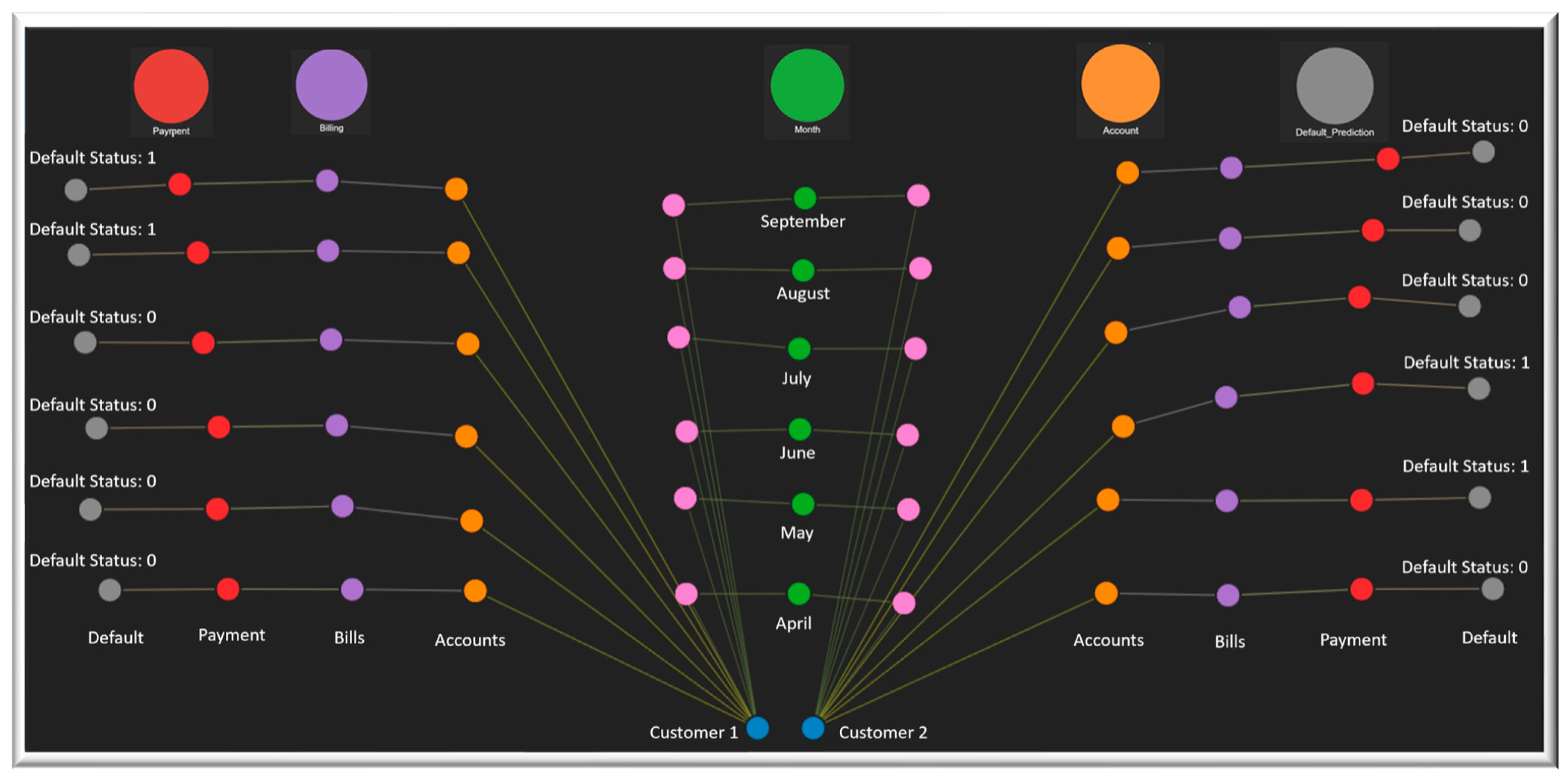 Figure 5 depicts the state evolution of two customers with default prediction status shown. The graph database allows queries to find explanations of the causal dependencies.