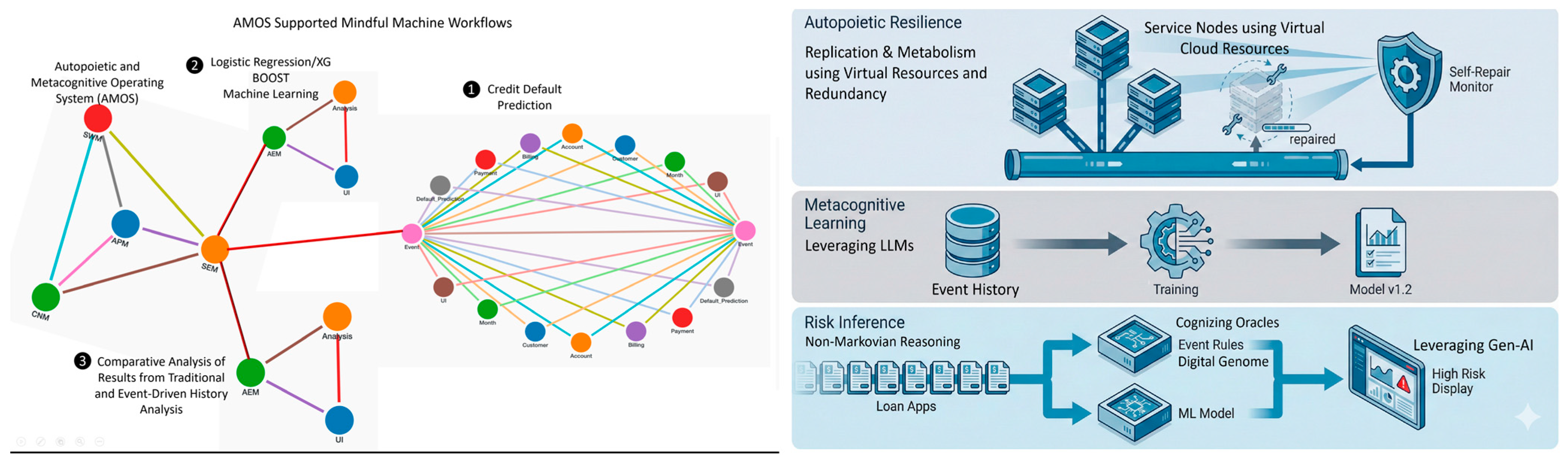 Crucially, the AMOS architecture allows the system to select or switch among these methods under changing conditions. The Autopoietic Process Manager (APM), Cognitive Network Manager (CNM), and Software Workflow Manager (SWM) can route specific customer segments or scenarios through different model variants based on policy rules or drift signals monitored by Cognizing Oracles. For example, when repayment distributions shift for a particular cohort, the system can temporarily prioritize the more conservative rule-based engine, fall back to a previously validated model, or deploy a retrained logistic regression variant—without redesigning the application or interrupting service. This hybrid, switchable configuration illustrates how Mindful Machines transform a static prediction pipeline into a governed decision ecosystem, where multiple methods are orchestrated in real time to preserve accuracy, transparency, and resilience.
