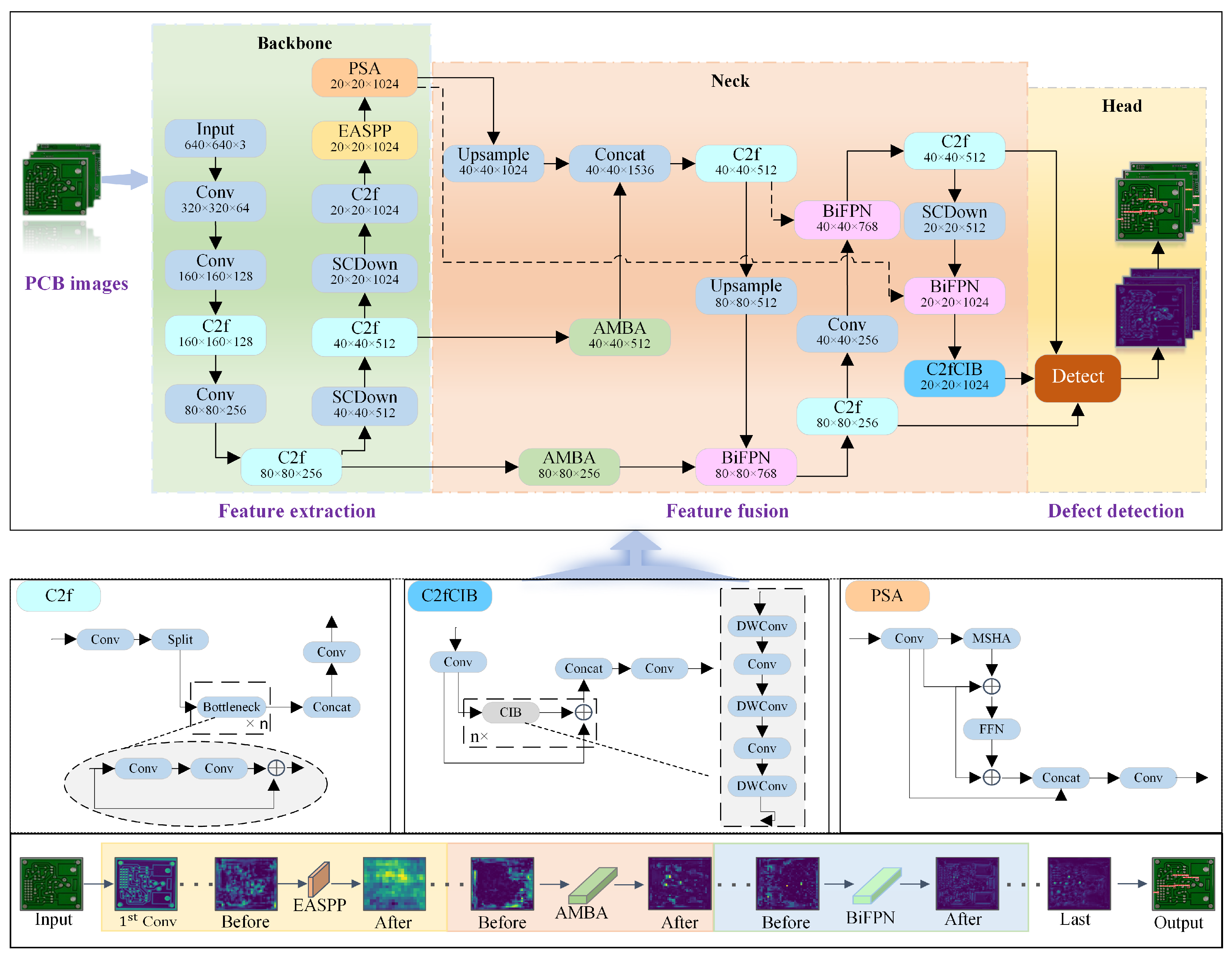 - A novel Efficient Atrous Spatial Pyramid Pooling (EASPP) module is developed. EASPP represents the first integration of our proposed AMBA with hybrid dilated convolutions. This co-design not only expands the receptive field to mitigate feature loss but also incorporates defect-aware feature recalibration, enabling more precise multi-scale feature extraction compared to standard modules.