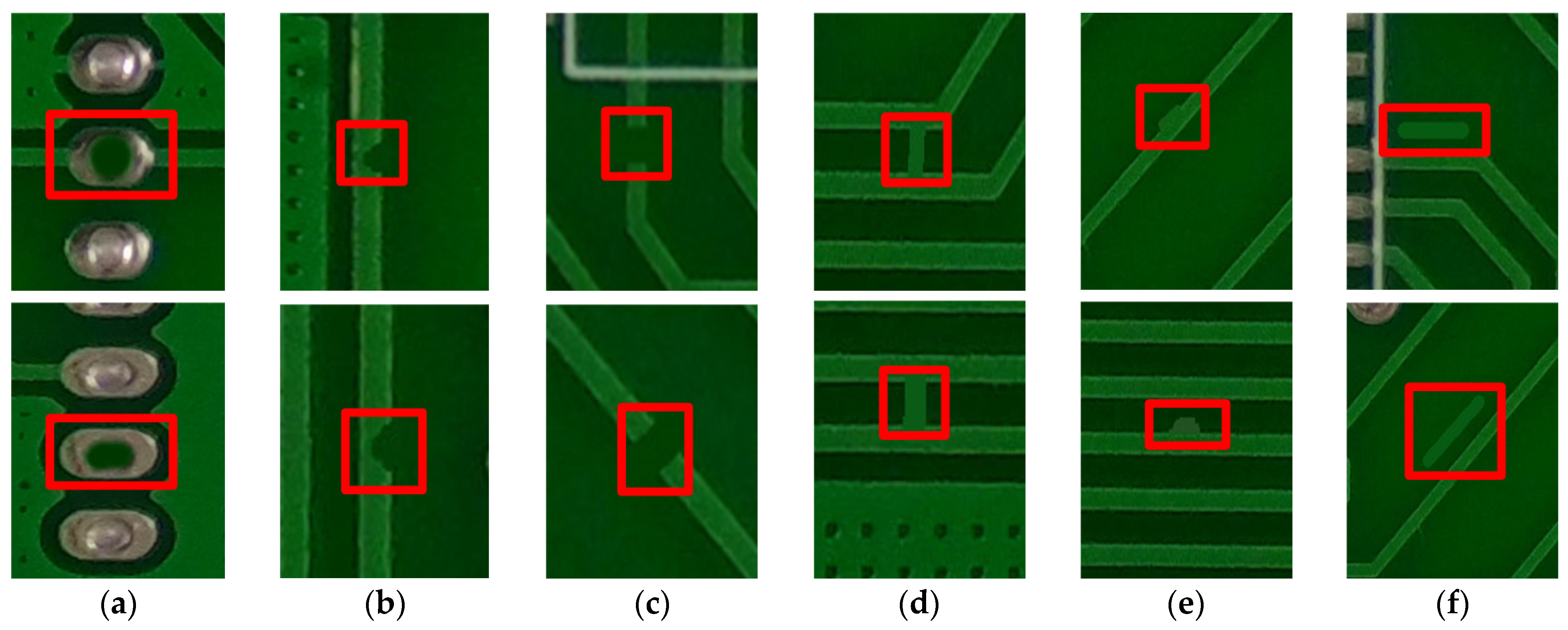 - Tiny defect detection limitations: With the improvement of PCB routing accuracy, the defect size is generally reduced to 0.1–0.5 mm2, which leads to the lack of feature representation ability of the network.