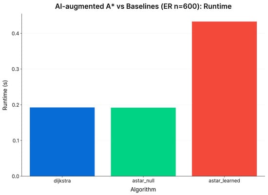 - AI-augmented A* (learned heuristic)In this study, we extend the A* algorithm by replacing the hand-crafted heuristic h(n) with a learned, target-aware estimate of the remaining distance-to-go. The search priority remains defined as f(n) = g(n) + h(n), where g(n) represents the cost incurred from the source node to node n, and h(n) is the learned prediction for the cost from node n to the target. Moreover, we primarily evaluate AI-augmented A* on Erdős–Rényi graphs of size n = 600, with additional topologies of comparable size analyzed in Section 5. This experimental setting was selected to strike a balance between structural realism and computational feasibility: the graphs are sufficiently large to exhibit non-trivial runtime and memory behaviors, yet small enough to facilitate extensive repeated trials across multiple algorithms. Consequently, our claims regarding learned-heuristic A* focus on the relative runtime–memory trade-offs within this operational regime, rather than on asymptotic scalability to massive-scale networks.Model and Features: we employ a lightweight Gradient Boosting Regressor to predict the shortest-path distance from source s to target t using node-level features derived from the current node n and the fixed target t. In our Erdős–Rényi (ER) experiments, with n = 600, we utilize the following features: