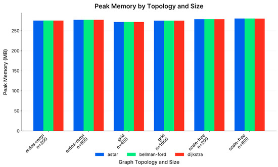 Median peak memory usage by topology and size. Bar heights represent the median peak memory (in MB) for each algorithm, aggregated over repeated trials (comprising multiple independent graph instances and random source–target pairs per configuration). Error bars indicate run-to-run variability; detailed statistical dispersion measures (Interquartile Range and Standard Deviation) are reported and analyzed in Section 4, particularly where memory profiles overlap.