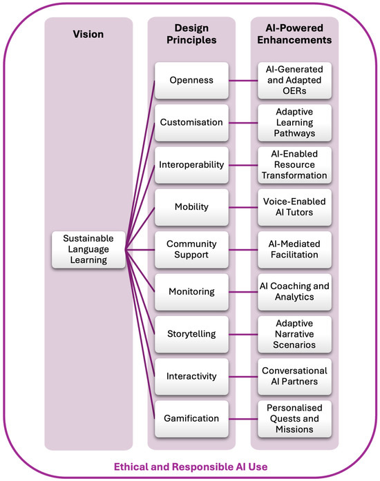 Figure 2 illustrates how Generative AI enhances the sustainable design framework of the OpenLang Network platform. Starting from the left, the first level represents the platform’s vision of sustainable language learning. The second level shows the nine sustainable design principles of the platform, i.e., openness, customisation, interoperability, mobility, community support, monitoring, storytelling, interactivity, and gamification. Finally, the third level visualises the AI-driven pedagogical innovations that amplify each principle, including adaptive learning pathways, AI-generated OERs, conversational tutors, and intelligent coaching. Surrounding all levels is a boundary representing the ethical and responsible use of AI.