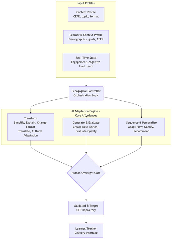 The pedagogical and functional enhancements described in the previous sections require an underlying technical architecture capable of supporting highly personalised, context-aware, and ethically governed AI interactions. To operationalise these innovations, the AI-enhanced OpenLang Network platform incorporates an AI-powered content adaptation architecture that can dynamically transform, generate, and evaluate learning materials in response to diverse learner needs and real-time learning states. This architecture is shown in Figure 3 and provides the infrastructural backbone that enables adaptive OERs, personalised learning pathways, conversational practice, and intelligent feedback mechanisms to function in a coherent, scalable, and pedagogically aligned manner.