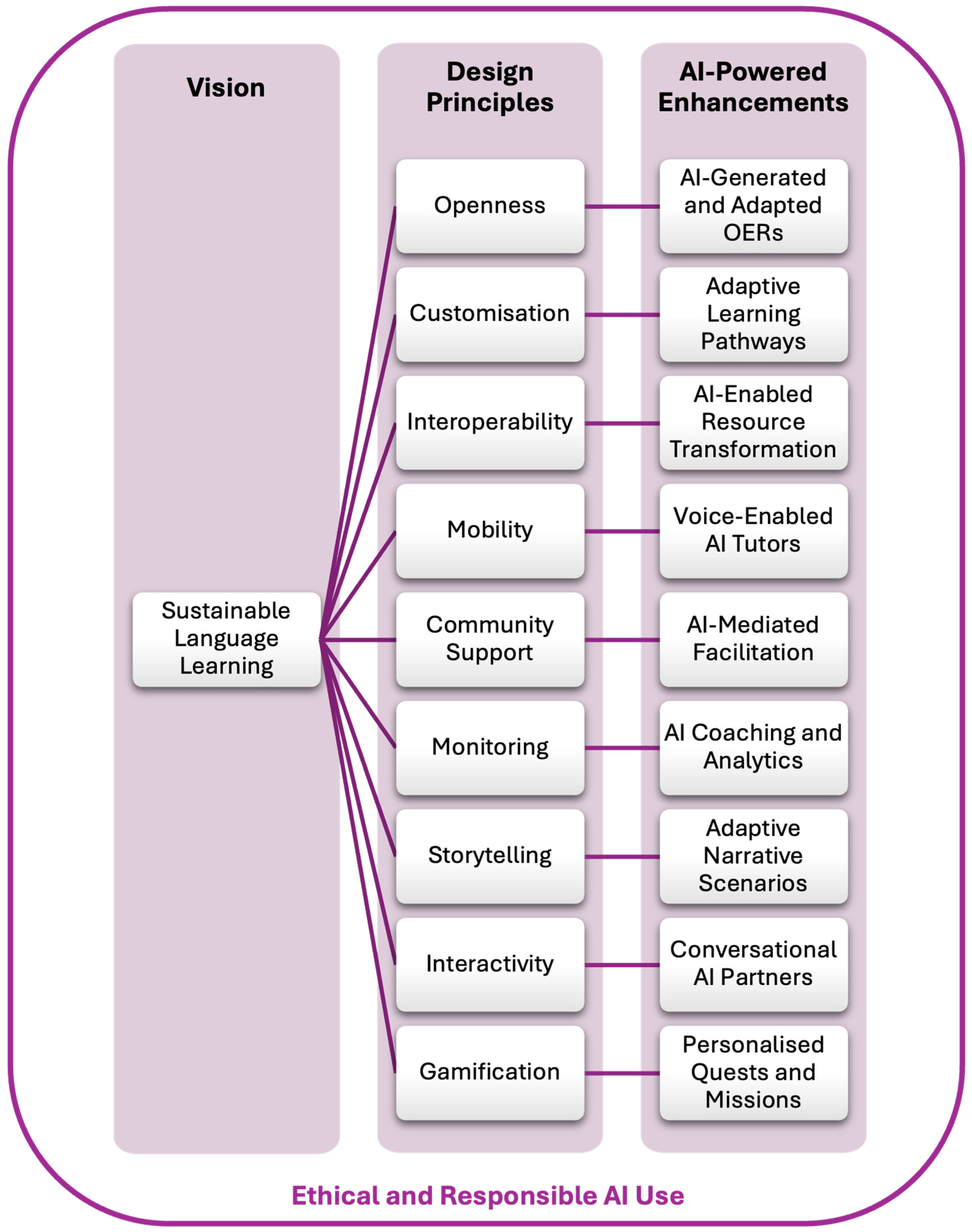 • It integrates Generative AI in language learning as a pedagogically driven extension of sustainable design principles.