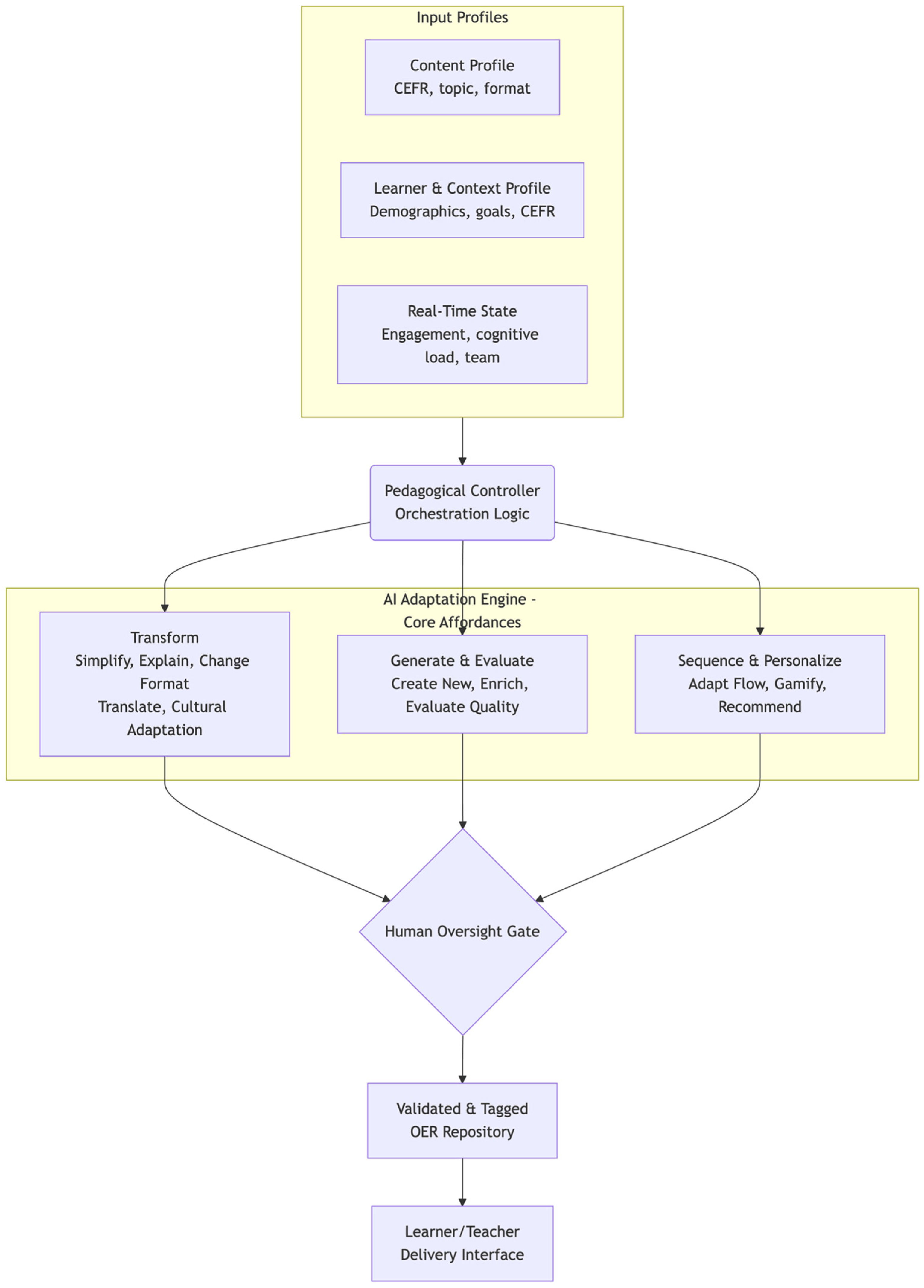 The pedagogical and functional enhancements described in the previous sections require an underlying technical architecture capable of supporting highly personalised, context-aware, and ethically governed AI interactions. To operationalise these innovations, the AI-enhanced OpenLang Network platform incorporates an AI-powered content adaptation architecture that can dynamically transform, generate, and evaluate learning materials in response to diverse learner needs and real-time learning states. This architecture is shown in Figure 3 and provides the infrastructural backbone that enables adaptive OERs, personalised learning pathways, conversational practice, and intelligent feedback mechanisms to function in a coherent, scalable, and pedagogically aligned manner.