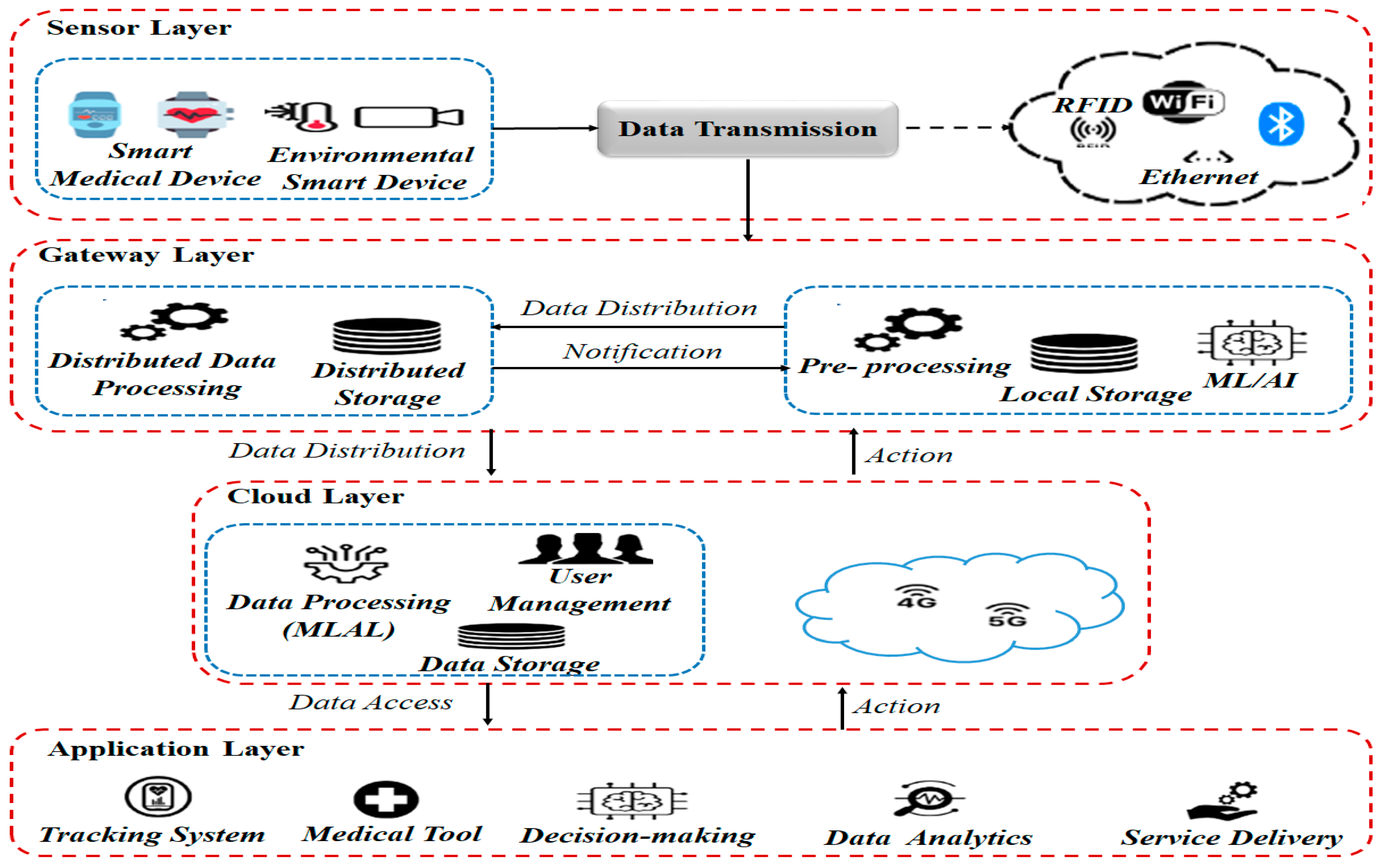 15]. The application layer performs data analysis activities by employing AI and ML methods to learn valuable insights from collected data. This layer facilitates the management of patient care by carrying out functions like data visualization, reporting, and decision-making. To ensure a complete approach to healthcare management, application layers offer additional technologies like tracking and remote patient monitoring [