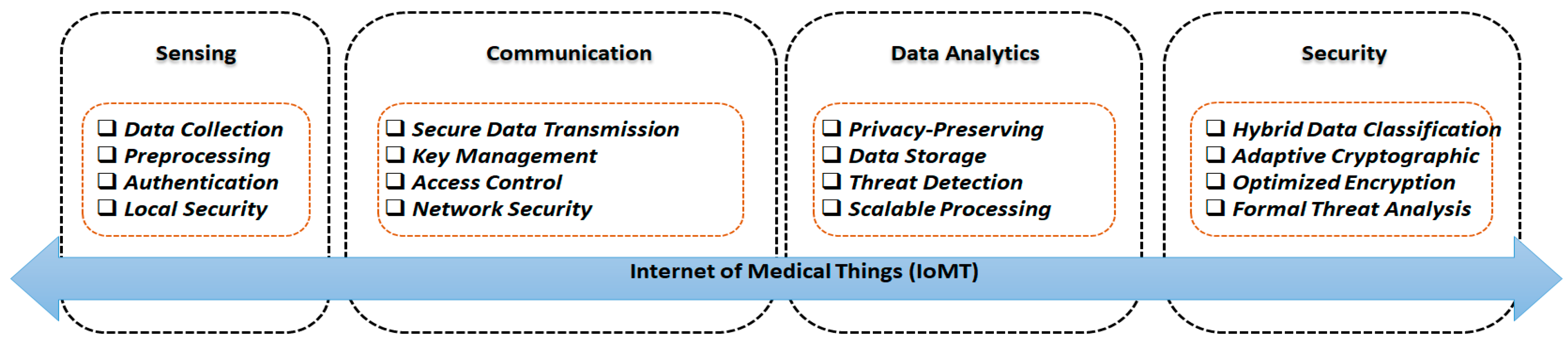 27]. With an emphasis on how they handle data sensitivity, cryptographic efficiency, and system scalability, these are the three main issues that the proposed hybrid encryption IoMT attempts to address.