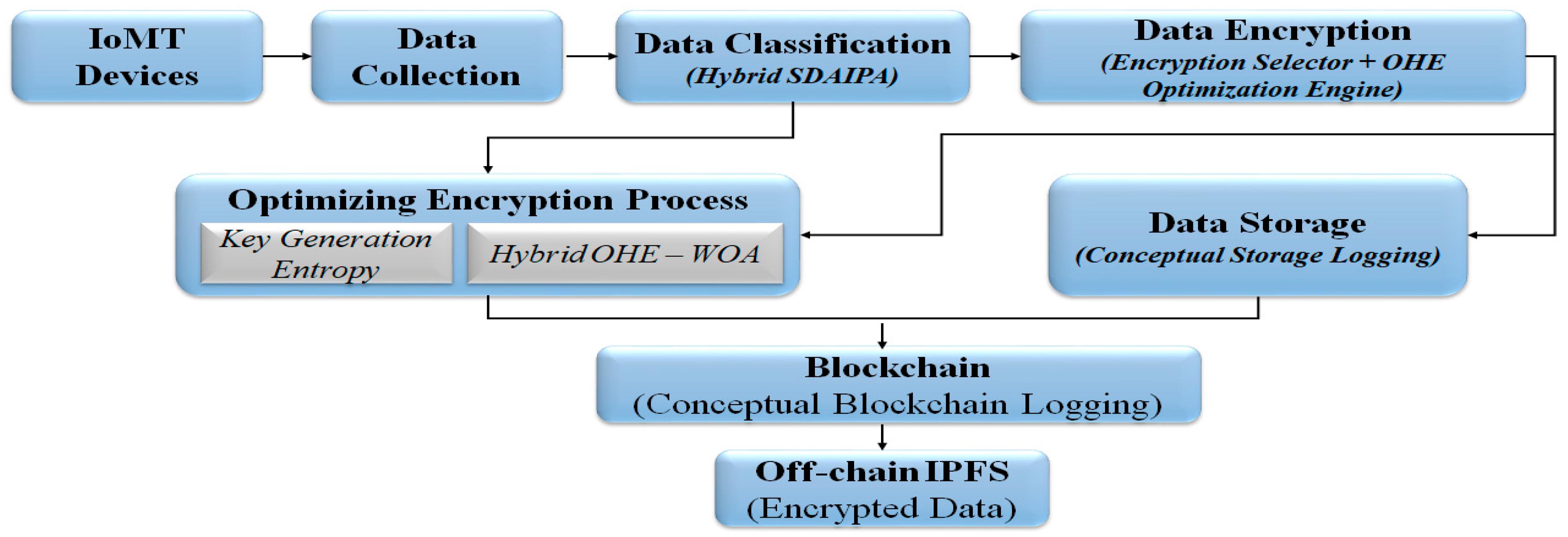 39]. To handle this gap, the proposed IoMT-based privacy-preserving system has enhanced features, like optimizing the OHE with WOA for safe computation on encrypted data with a hybrid SDAIPA data categorization model for regulatory-compliant sensitivity labeling. It also has a scalable hybrid storage architecture that uses IPFS for encrypted payload storage and a permissioned blockchain for transaction recording [