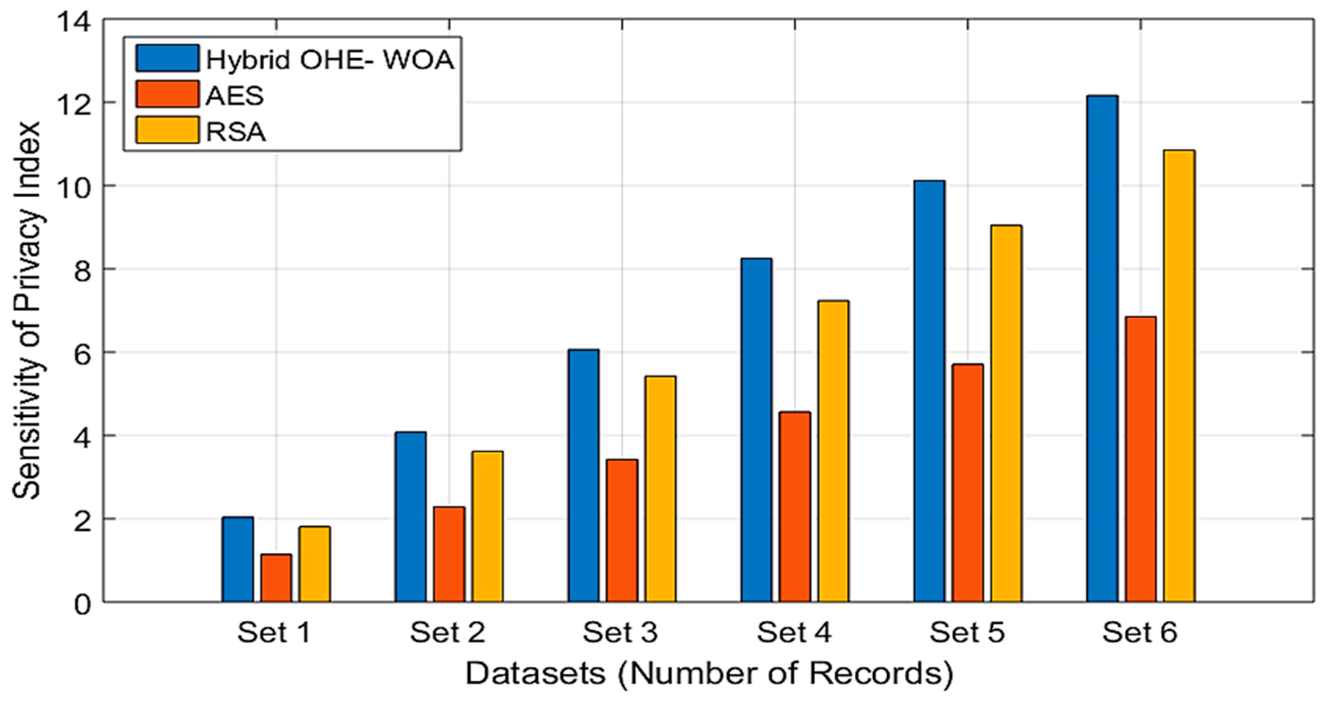 The performance of the hybrid OHE-WOA approach on two datasets shows close values of SPI, significantly higher than both AES and RSA. For example, in set 6, the largest and most sensitive dataset, the SPI of OHE-WOA rises between 12 and 12.5, while RSA peaks at around 11.0, and AES lags far behind at around 6.8. This trend is a direct result of the adaptive nature of the system. As the dataset grows and the proportion of highly sensitive records increases, the proposed SDAIPA classification model with OHE-WOA can accommodate more data points. Since OHE-WOA has the highest entropy in both datasets, which is significantly higher than the entropy of 115.2 bits of AES or 1843.2 bits of RSA, its SPI increases significantly. The sensitivity weighting further enhances this effect, ensuring the highest level of privacy when needed.