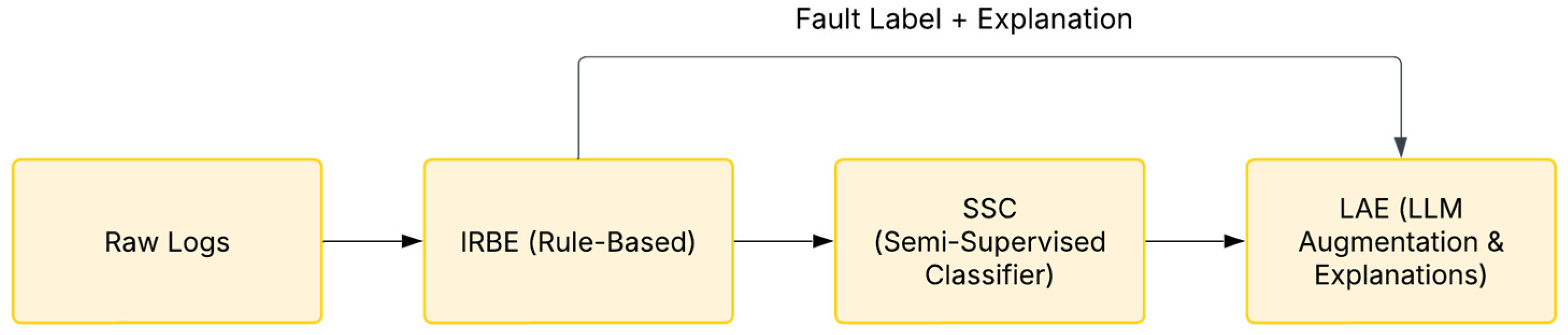 - Robust Semi-Supervised Learning: We develop a semi-supervised fault classifier that uses pseudo-labeling to make use of real-world log data where labels are scarce. The SSC is initially seeded with high-precision labels from IRBE and iteratively improves its coverage by labeling new samples with a confidence-based mechanism [5]. This approach exploits large unlabeled log corpora to enhance the detection of subtle or latent fault patterns that rules alone might miss. We show that our SSC achieves higher recall and F1 than a purely supervised classifier trained on the limited available labels, consistent with other log analysis works that saw F1 improvements over 180% via probabilistic label estimation [6].