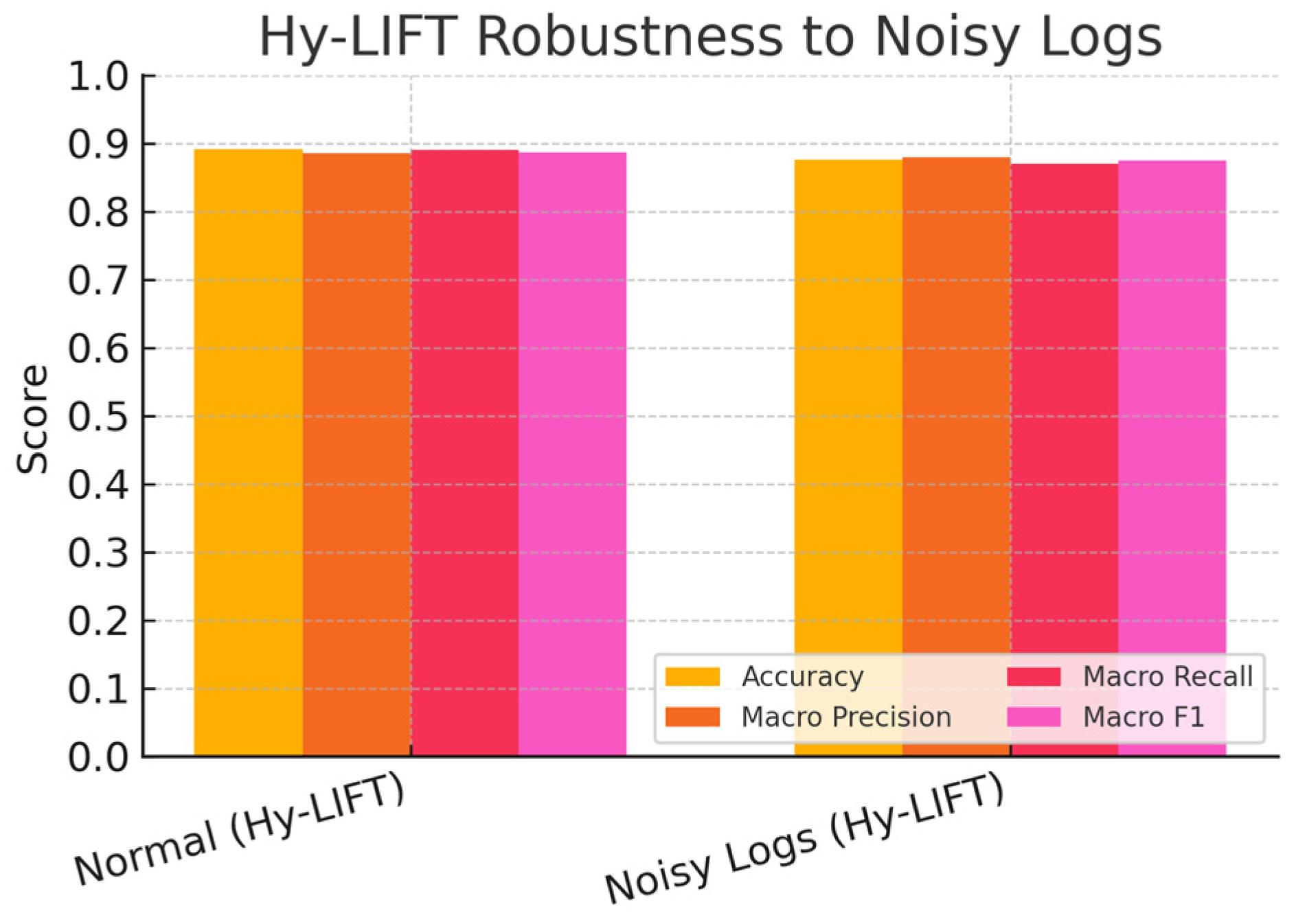 - After adding synthetic noise to 10% of log lines (random character insertions or irrelevant debug messages), the performance of Hy-LIFT dropped only marginally (accuracy went from 89.2% to 87.6%). The IRBE rules were mostly unaffected (they look for specific substrings that remained intact), and the ML model, having seen many log variants, was resilient to extra lines. This suggests our feature extraction (which focused on counts of key events, presence of keywords, etc.) is fairly noise-tolerant. Minor format perturbations did not derail the analysis, a positive sign for deployment, where logs can contain extraneous info.
