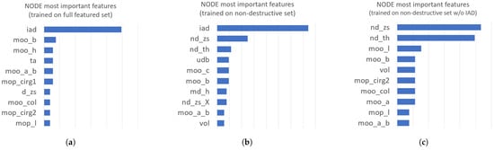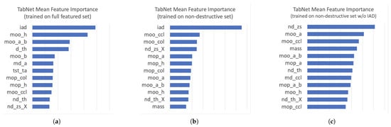 Mean feature importance plots for TabNet models: (a) full feature set, (b) non-destructive feature set, and (c) non-destructive feature set without the iad variable.
