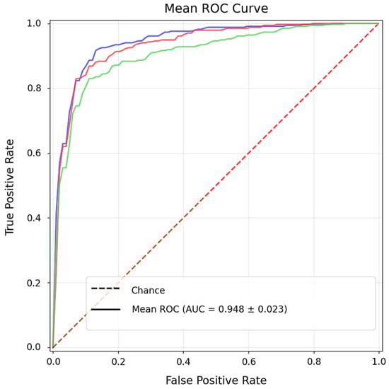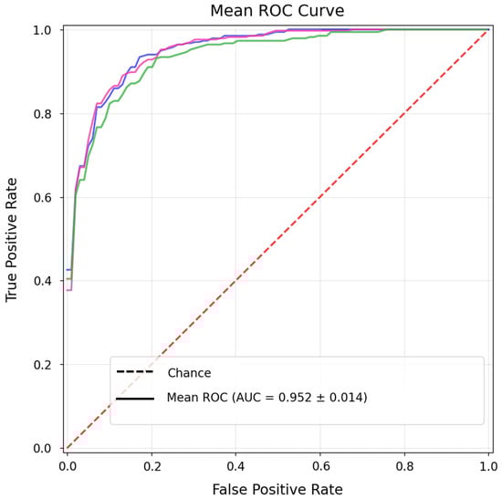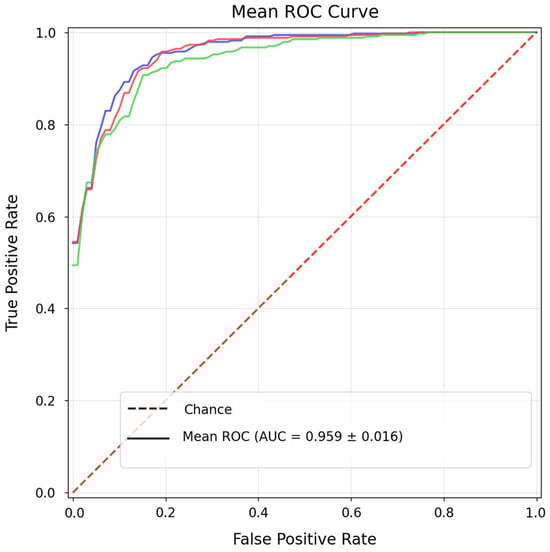 Figure 8 and Figure 9c illustrate that the overall discriminative capability remains high. The mean ROC curve confirms a robust average AUC of approximately 0.943, while the learning curves show stable convergence and effective regularisation.