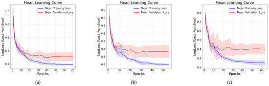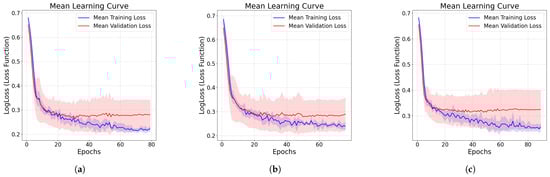 Model training and validation loss curves for the three TabNet configurations. (a) Full feature set; (b) non-destructive feature set; (c) non-destructive feature set without iad. Solid lines represent mean loss values across the five cross-validation folds, while the shaded areas indicate variability across folds.