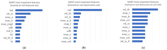 The permutation importance analysis identified a set of fifteen non-destructive variables as the most informative predictors for the SAINT model. For clarity of presentation, Figure 7c displays only the ten highest-ranked features; however, these correspond closely to the top part of the full fifteen-feature ranking used during model optimization.