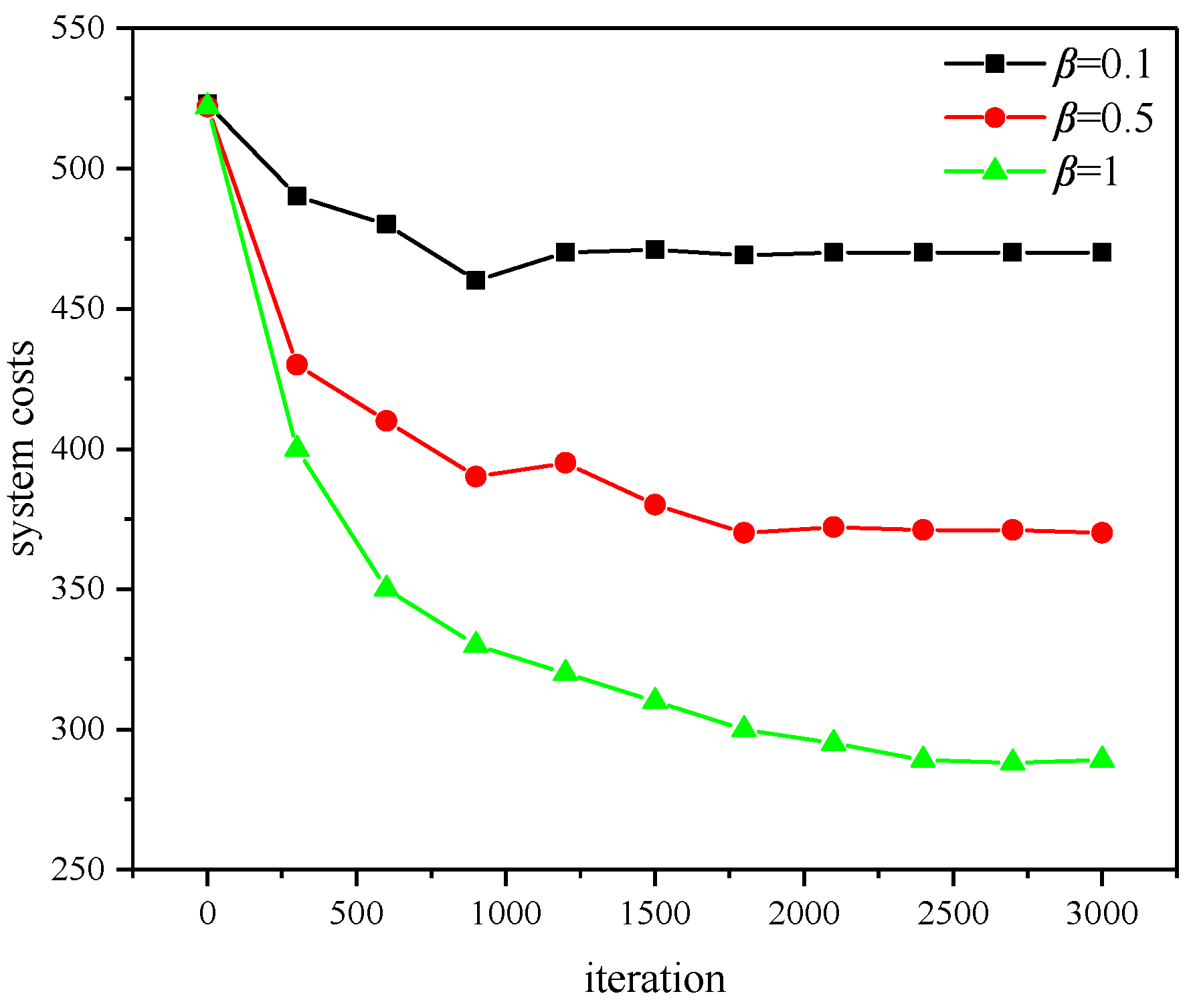 = 1, the curve is almost smooth and converges after approximately 2400 iterations, with a converged value below 300. As