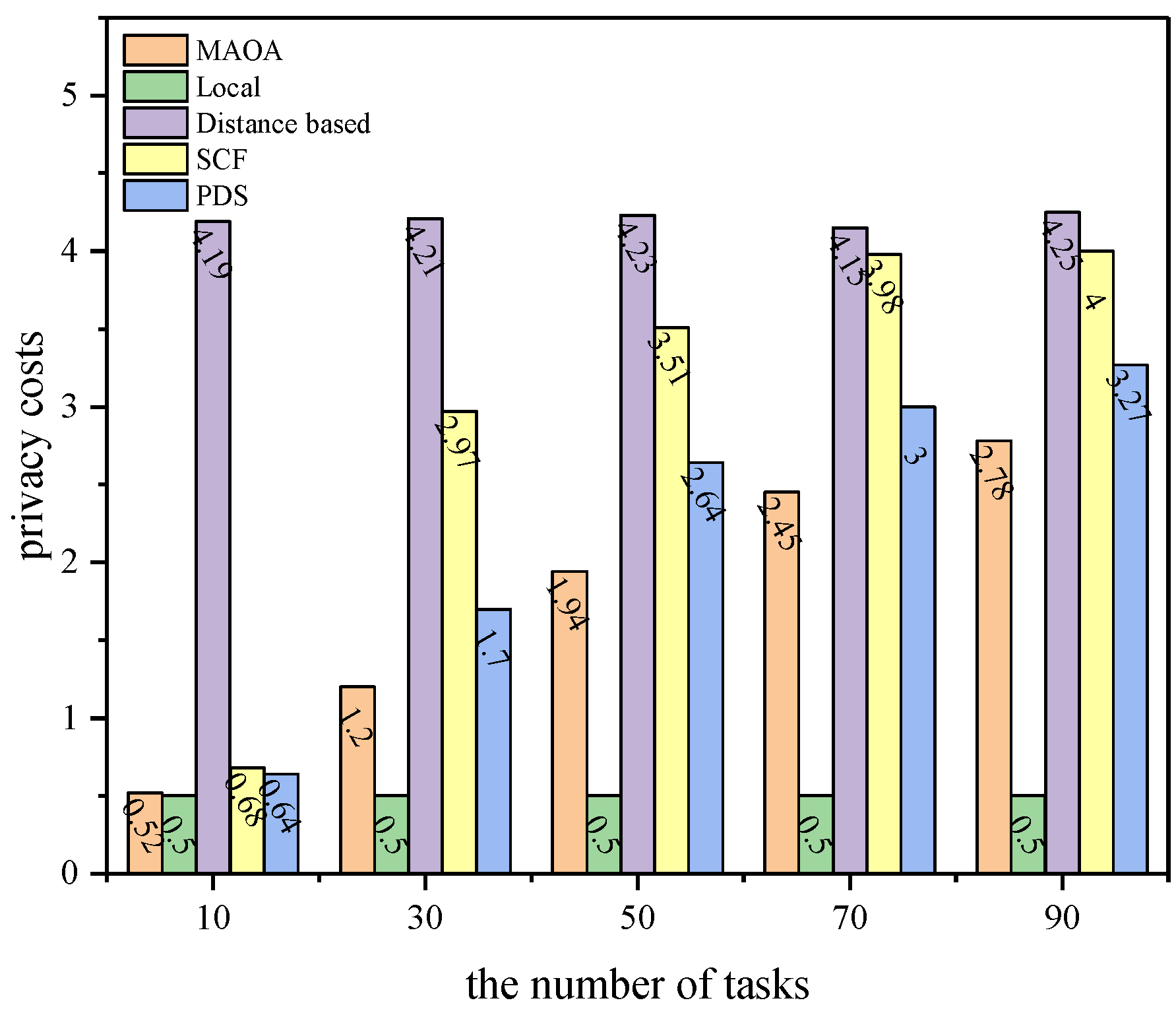 Figure 4, as the size of the task set increases, the privacy loss of all the reference algorithms increases, but the privacy loss of the proposed algorithm is smaller than that of the SCF and PDS schemea. Although the PDS scheme also protects location privacy, it does not consider the problem of trajectory privacy leakage, so the privacy protection effect of the proposed scheme is better. Since the Local scheme completely calculates tasks on the local device and does not access the edge service, it does not leak access information to attackers. However, since attackers can still infer the location of the vehicle based on some other information, its privacy loss still exists but is the smallest and remains unchanged. When the size of the task set is 10, the local device is able to complete all tasks, so the privacy loss values of the Local, SCF, PDS, and MAOA scheme are relatively close. When the size of the task set is 30, 50, 70, and 90, the local device cannot complete all tasks, and except for the Local algorithm, all other algorithms need to offload some tasks to the edge server, resulting in the leakage of access information and an increase in the privacy loss of the offloading strategy.
