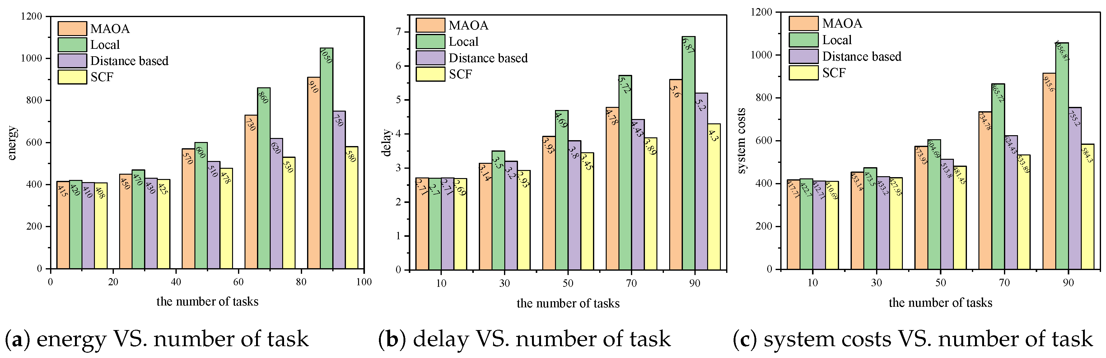 Figure 7a, when the privacy constraint is 1, the three indicators of the MAOA scheme are similar to those of the Local scheme. When the privacy constraint is 5, the MAOA scheme is similar to the minimum system cost scheme SCF, indicating that the proposed scheme has a lower system costs.