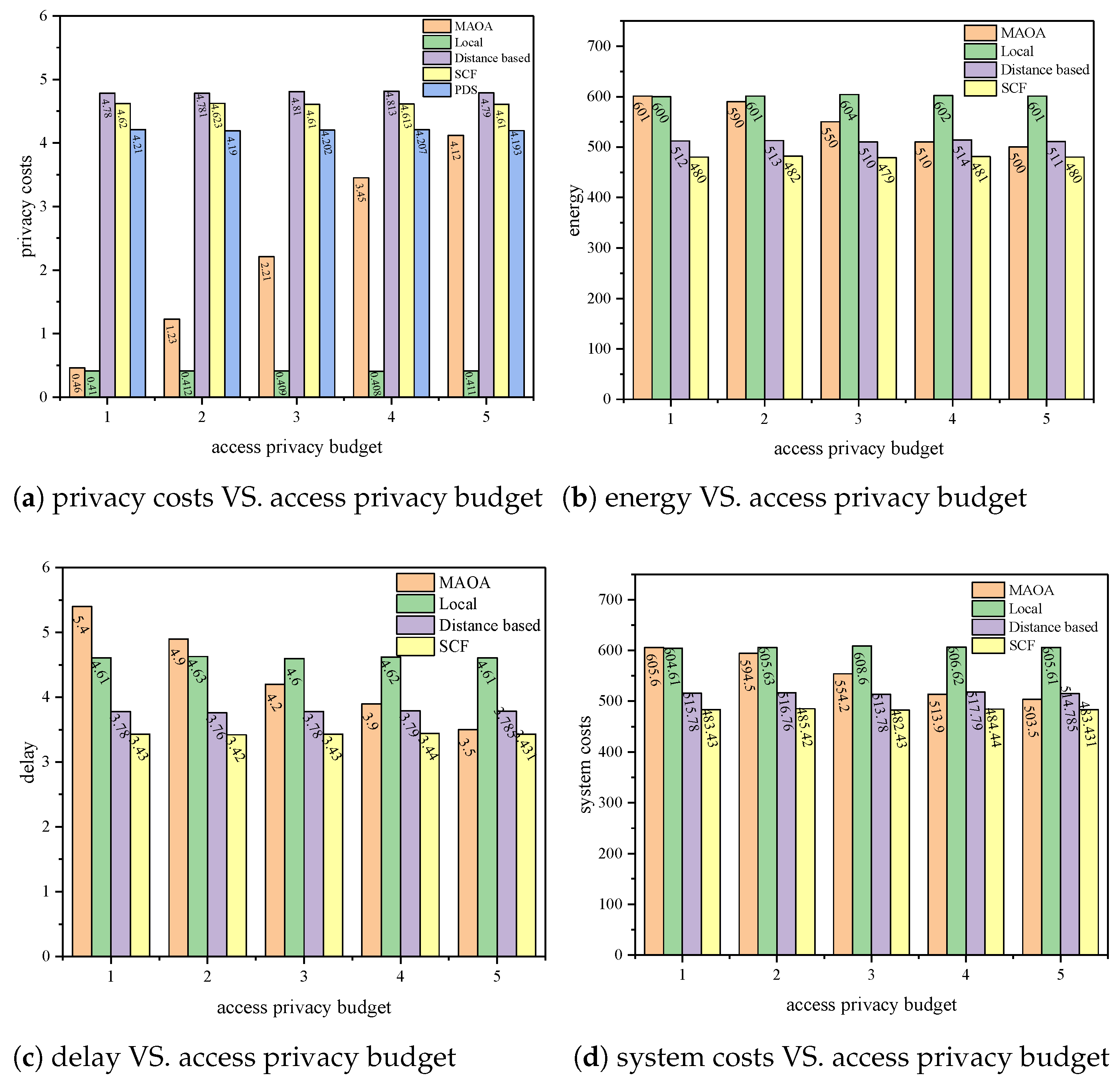 Figure 6a, the Local scheme has the smallest access privacy loss, while the Distance-based scheme has the largest privacy loss. The MAOA scheme’s privacy loss increases as the budget increases. This is because the Local scheme performs all tasks locally, leaking less information. On the other hand, the Distance-based scheme selects the server with the nearest distance for calculation, resulting in more access points, which leaks more trajectory information. When the offloading strategy privacy budget is 1, due to the small budget, the MAOA scheme can only choose local computation to protect privacy, so its privacy loss is similar to that of the Local scheme. When the budget is 5, due to the large privacy budget, the MAOA scheme prefers to minimize the system cost by selecting more servers for task calculation, resulting in a larger privacy loss, and its real-time privacy loss is similar to that of the PDS scheme. However, in total, compared to the PDS scheme with single-point location protection, the privacy loss caused by the proposed scheme is smaller due to the simultaneous budget of access privacy loss and offloading strategy privacy loss.