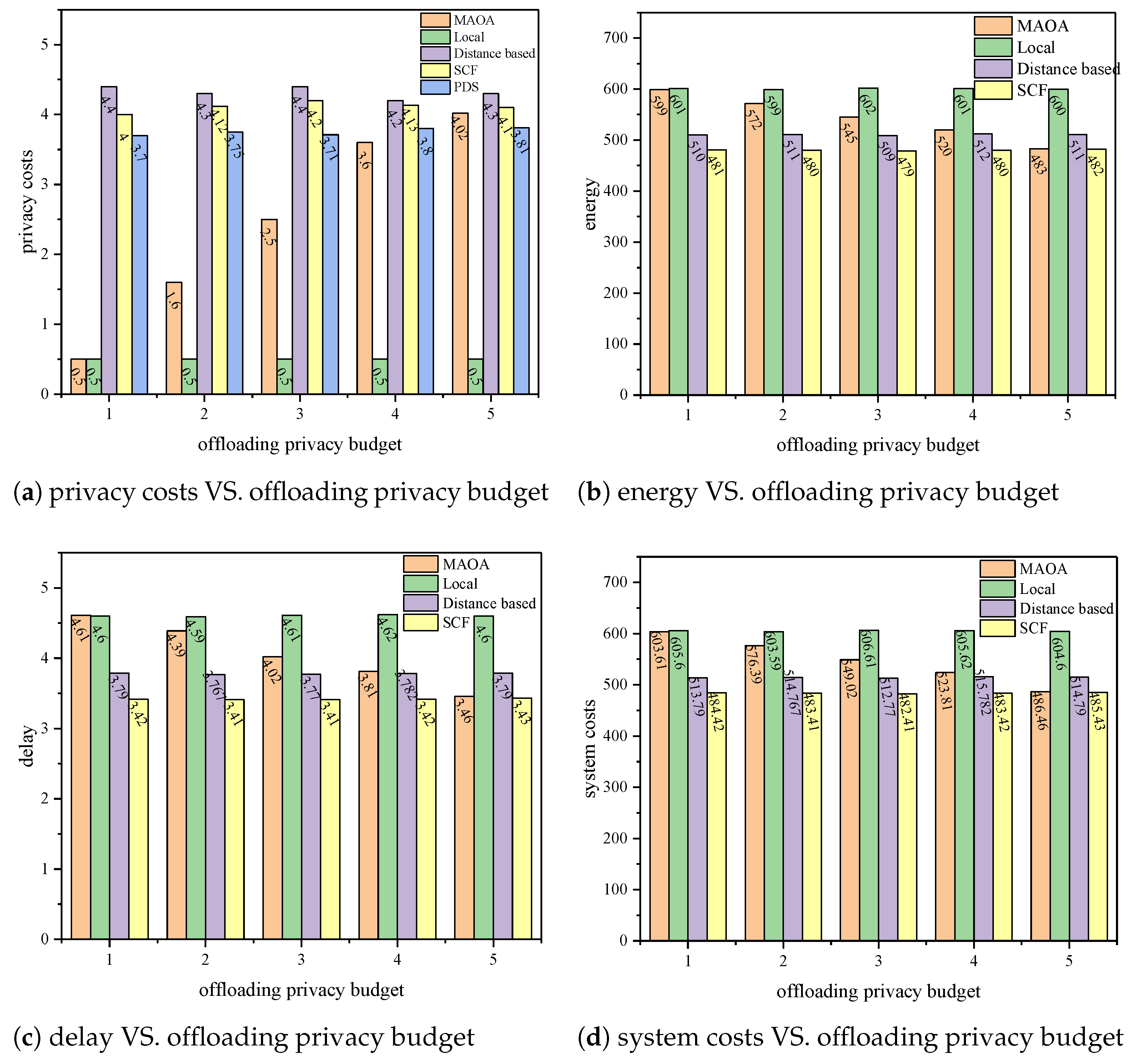 Figure 7 shows the the effect of offloading strategies privacy budget being 1, 2, 3, 4, and 5 on the scheme performance, with the task set size set to 50 and the access privacy budget set to 3. Similar to