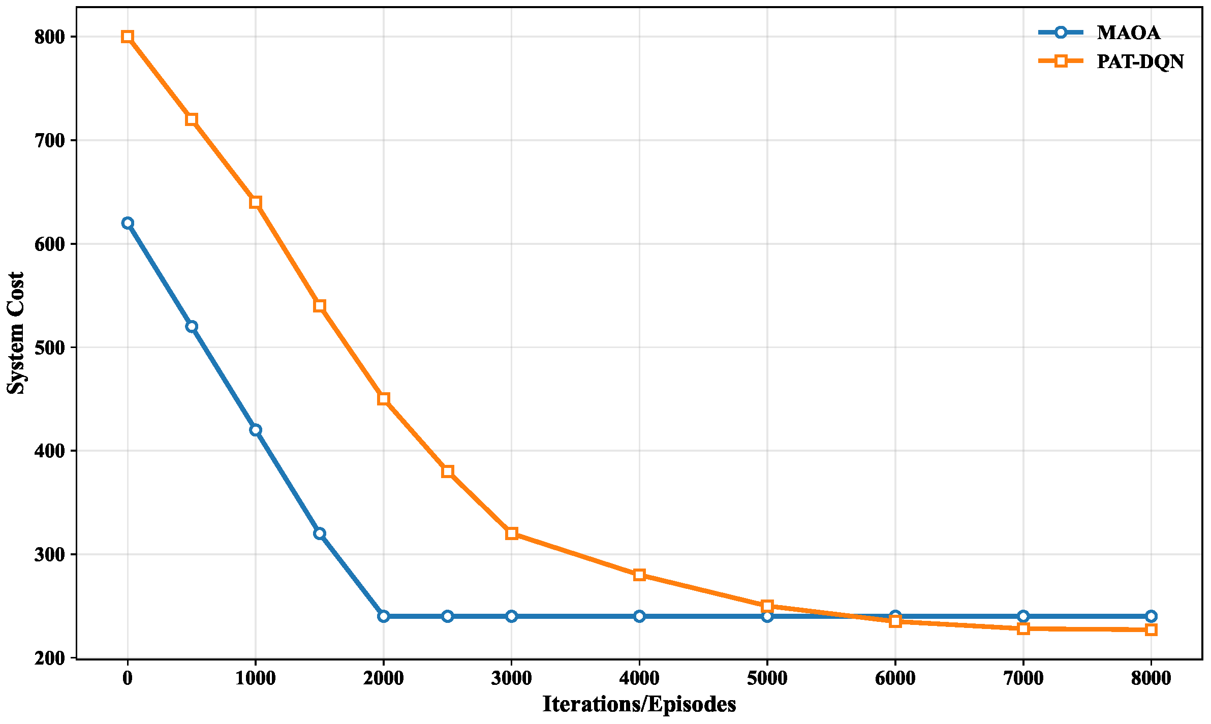 Figure 8 illustrates the convergence behavior of MAOA and PAT-DQN under a fixed task load (N = 50). The MAOA algorithm converges rapidly within approximately 2000 iterations, benefiting from the explicit mathematical formulation of the Markov approximation framework. In contrast, PAT-DQN requires a longer training phase (around 8000 episodes) to stabilize, as it learns the optimal policy through environmental interactions without prior system modeling. However, once trained, PAT-DQN achieves a 5.3% lower average system cost than MAOA, demonstrating its superior ability to discover more efficient scheduling strategies in complex state spaces.