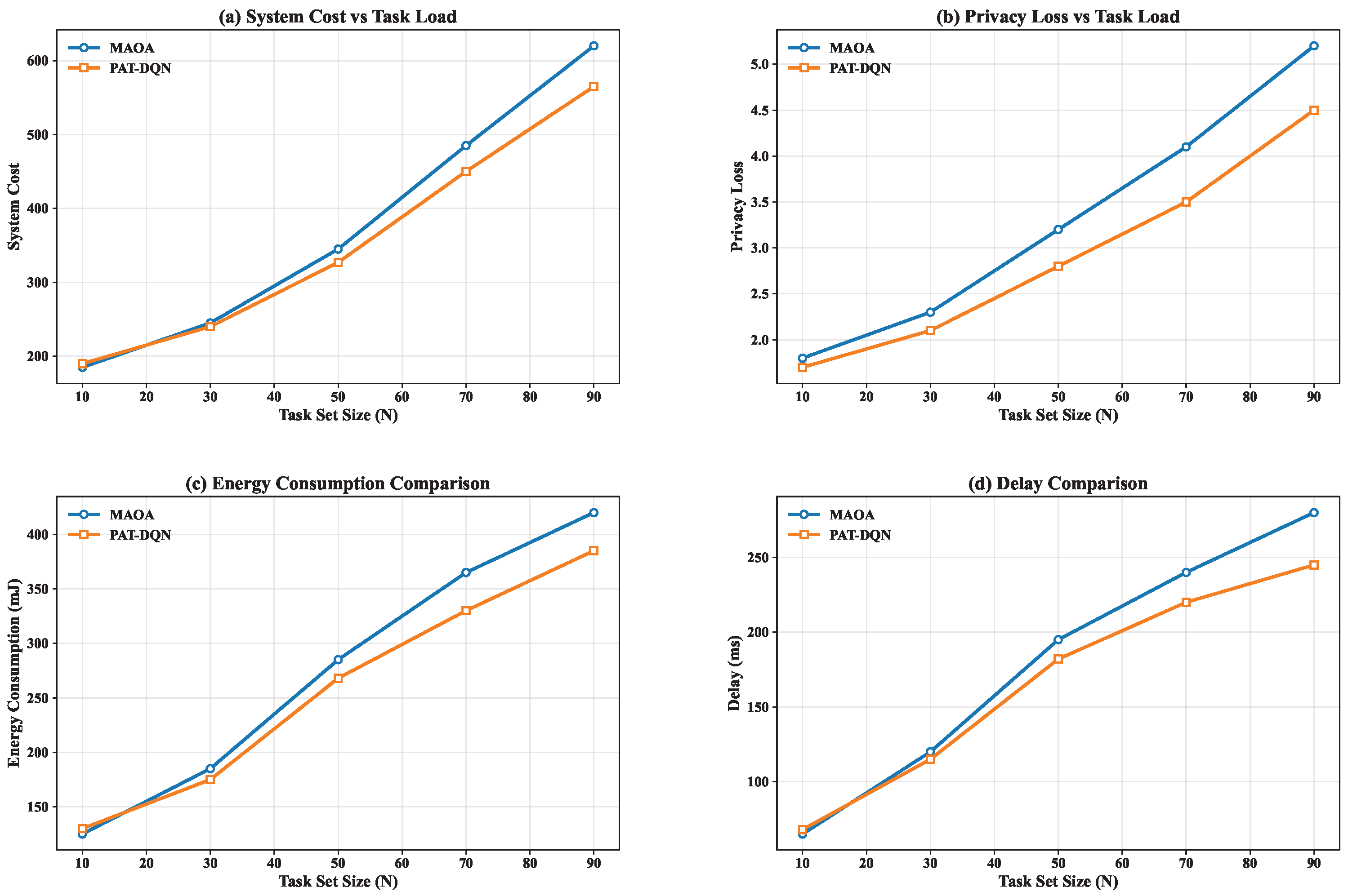 Figure 9 shows the performance of both algorithms under varying task loads (N from 10 to 90). As the task load increases, both algorithms exhibit rising system costs and privacy losses, but PAT-DQN maintains a more stable privacy-cost trade-off. Specifically, when N = 90, PAT-DQN reduces the privacy loss by 12.7% compared to MAOA while achieving comparable system costs. This advantage stems from PAT-DQN’s capacity to learn non-myopic policies that anticipate future states, thereby making more strategic decisions that mitigate cumulative privacy leakage.