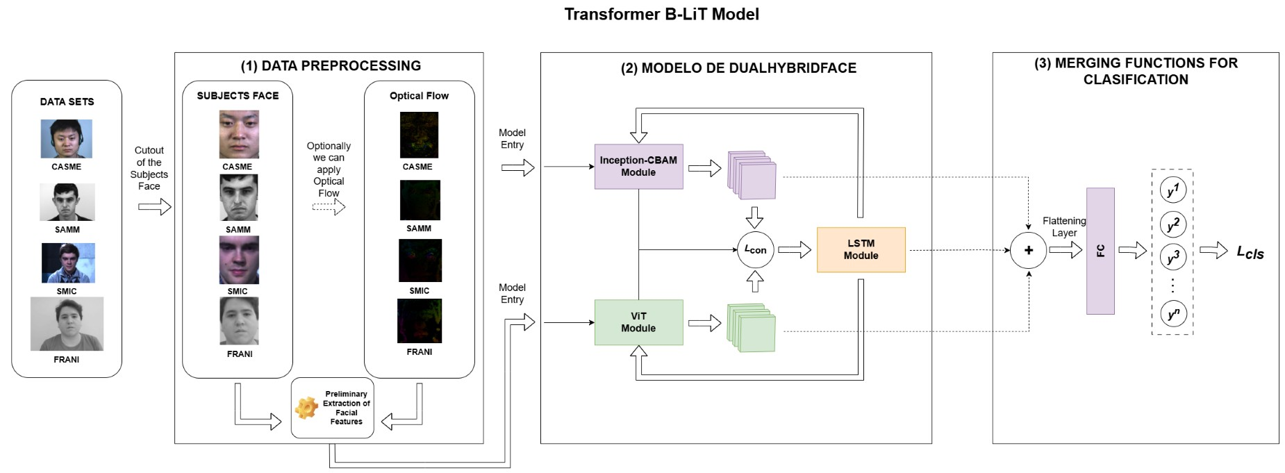 - Transformer DualHybridFace_LSTM: This module is similar to DualHybridFace but incorporates an LSTM layer after the vit_pos branch. The output of the LSTM is combined with the features from the incep_sca branch and passed through a fully connected layer for classification. It includes the following hyperparameters: