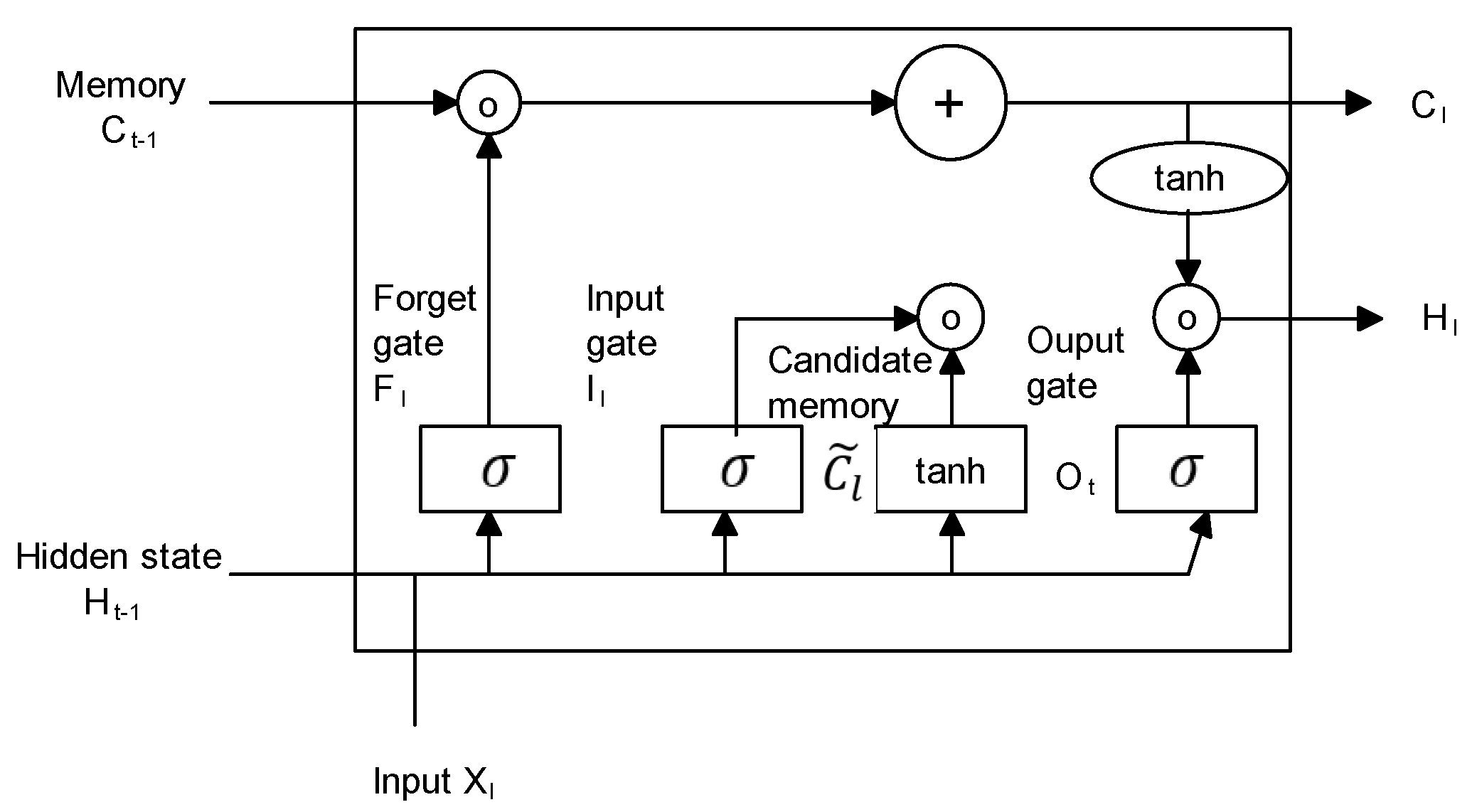 - tanh is the hyperbolic tangent function applied to the cell state.