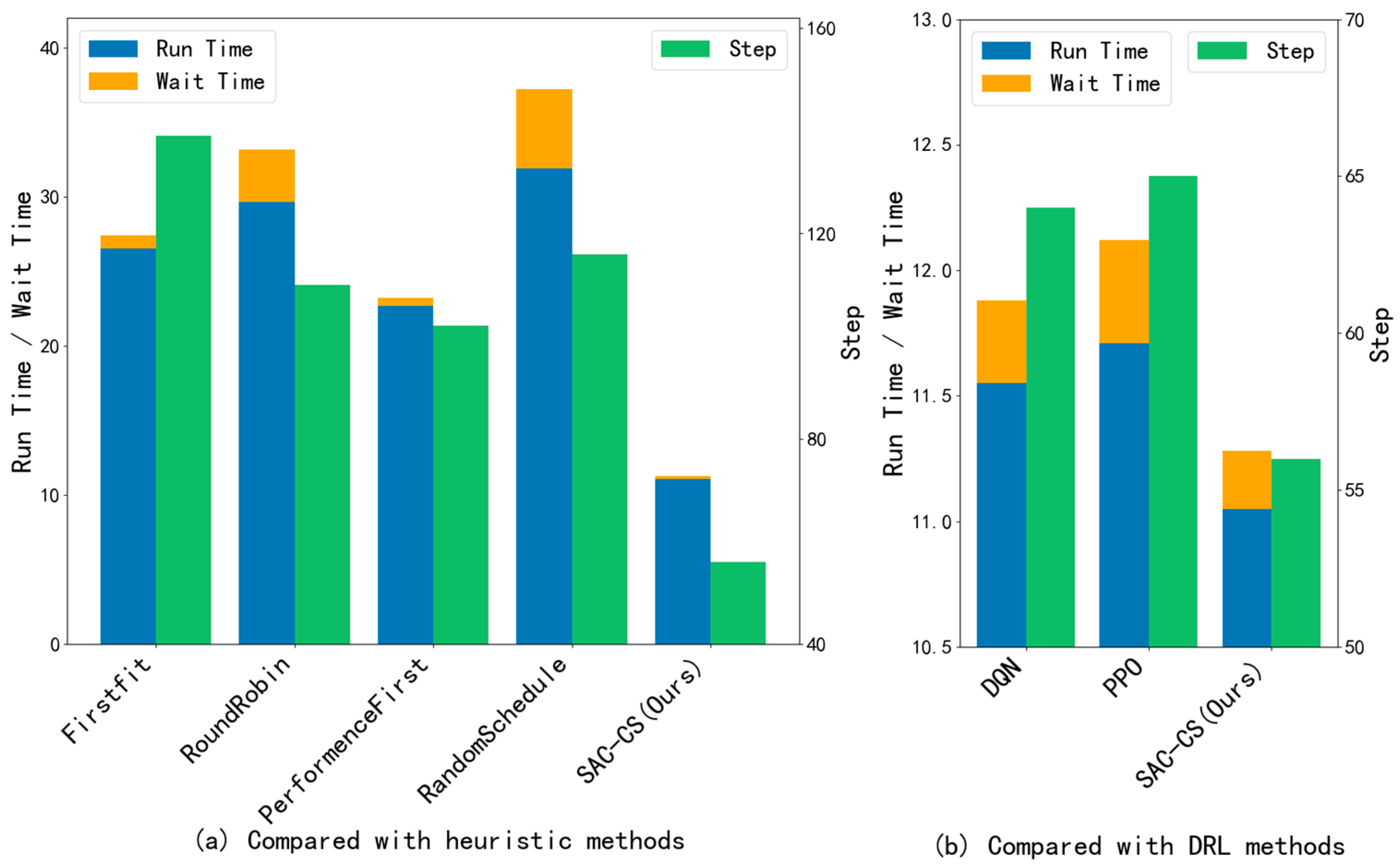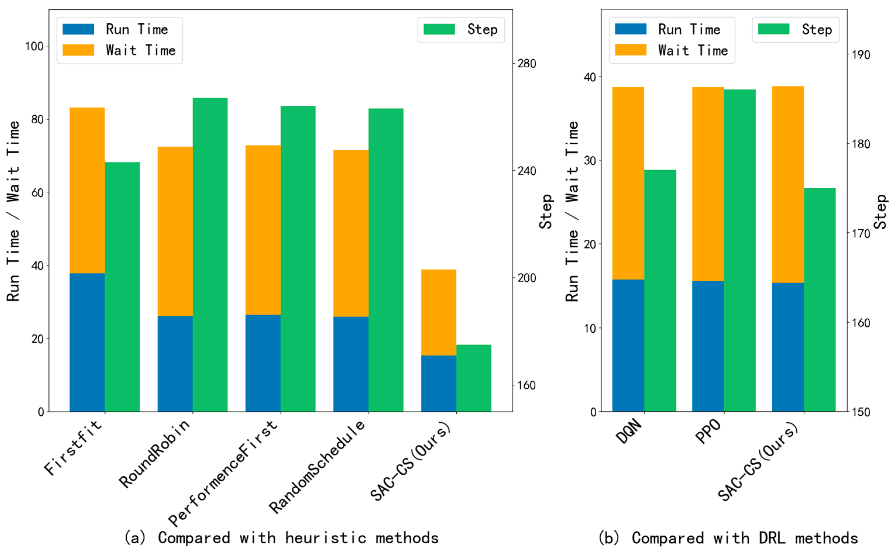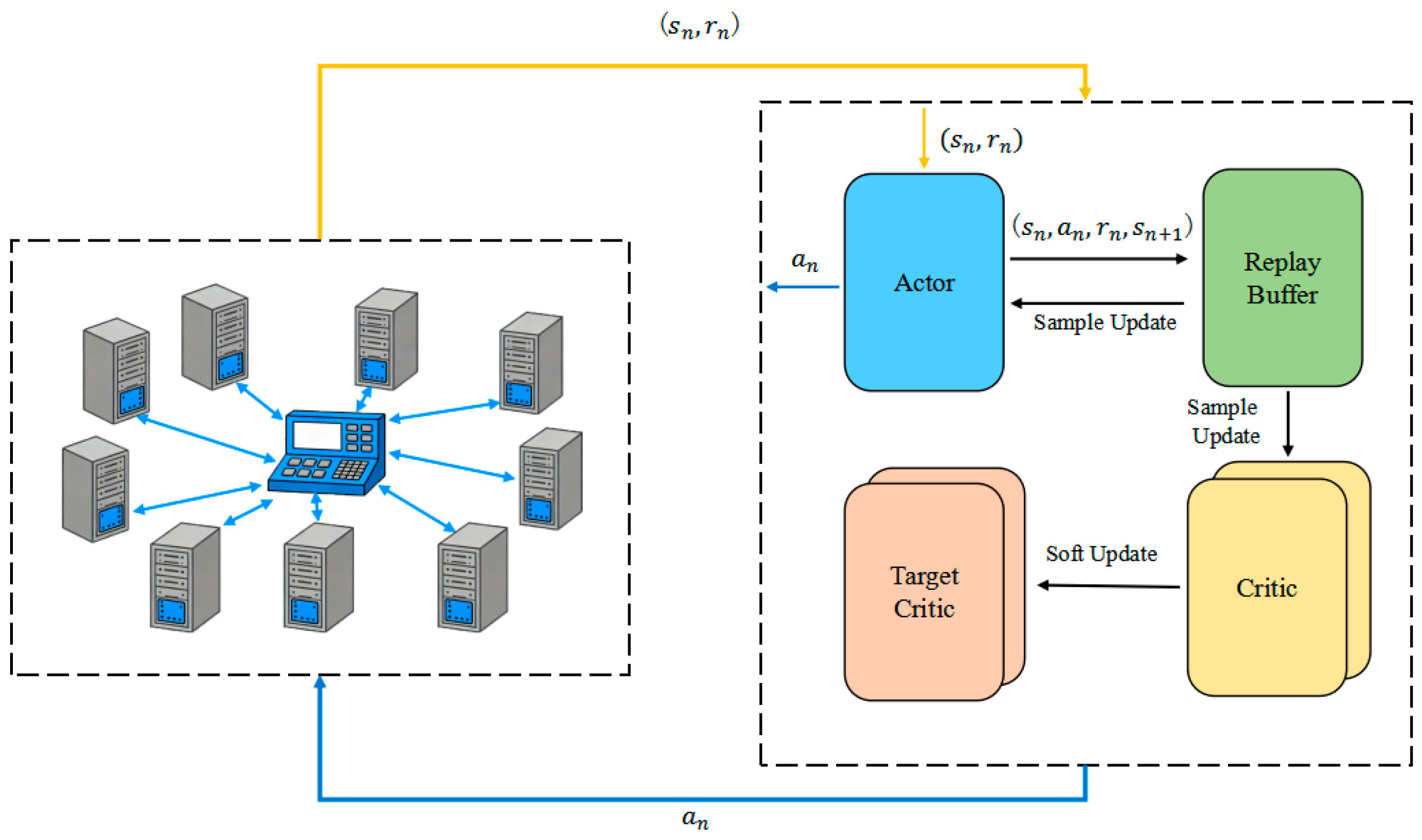8] presents an online resource scheduling framework based on the Deep Q-Network (DQN) algorithm, which balances two optimization objectives—energy consumption and task interval—by modulating the reward weights assigned to each. The Soft Actor–Critic (SAC) algorithm, grounded in a maximum entropy framework, not only maximizes cumulative rewards but also encourages policy exploration, thereby reducing the risk of convergence to local optima. SAC demonstrates strong adaptability in multi-objective optimization and dynamic environments, effectively addressing challenges related to task duration and energy consumption in container scheduling.