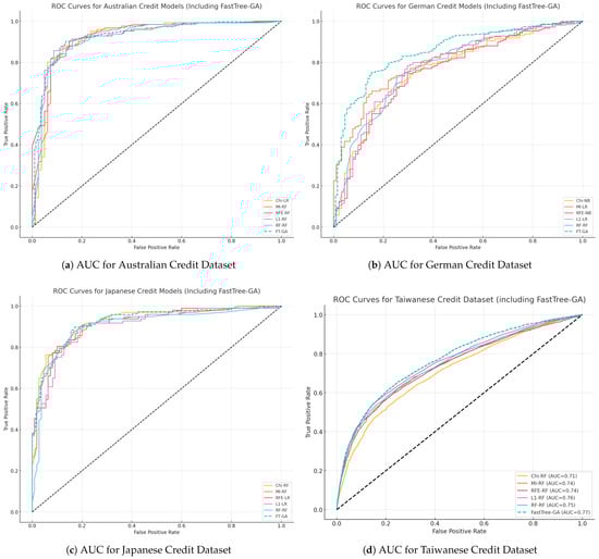 Table 9 provides the overall performance between the best-performing pairs retrieved from Table A1, Table A2, Table A3 and Table A4 listed in the Appendix A, and Figure 2a–d visualize their AUC in all datasets used. Overall, FT-GA demonstrated competitive results, especially with those given by RF, and better adaptability across different datasets. This is evidenced by the numerous combinations pairing feature selection and training models in order to achieve close results, considering the inclusion of top-performing baselines only. This positions FT-GA as a robust and generalizable choice to balance between feature reduction and obtaining contextual results, which in our case include accuracy and separability between classes. The same applies from a risk-assessment standpoint, where our proposed method achieved the highest AUC values for relatively smaller datasets, in the case of Australian and Japanese datasets, and also maintained a good balance between offering opportunities to applicants and flagging potential defaulters. This balance was demonstrated by recall values exceeding 0.90 and 0.88 for the Australian and Japanese datasets, respectively. It is also worth noting that variation in model accuracy across datasets is expected, as performance is inherently influenced by dataset complexity, particularly differences in sample size and class imbalance. Accordingly, datasets with milder imbalance and clearer signal structure yielded higher predictive ceilings, whereas highly imbalanced or larger ones imposed lower attainable accuracy levels for all competing methods. Nonetheless, the results suggest that FT-GA performs best when minority class representation is sufficient for the boosting component to learn discrimination boundaries, whereas traditional methods tend to overfit majority behavior. In general, this reflected a higher level of flexibility in terms of guiding a selection method towards more promising and domain-specific results, thereby aligning with practical needs.