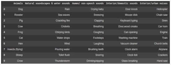 Deep learning techniques in general and CNNs in particular have emerged as the predominant choice for tasks like acoustic scene classification. The most effective CNNs primarily utilize audio spectrograms as input, drawing architectural inspiration mainly from computer vision principles [40,45,51]. In our approach, all audio files are transformed into spectrograms using the Librosa Python library, a package for music and audio analysis [52,53]. This proposal examines the capacity of CNNs to classify concise audio recordings of environmental sounds. Figure 2 presents a screenshot exemplifying the environmental audio files of the dataset used.
