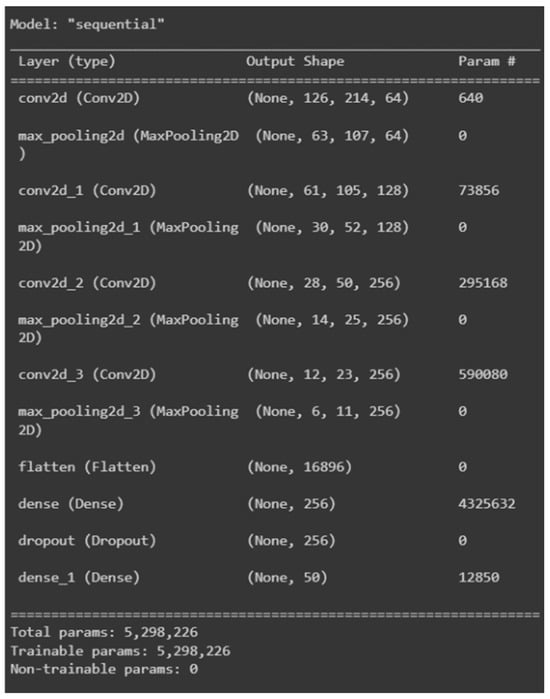 Following augmentation, four Convolution2D layers were introduced to enhance accuracy, complemented by the addition of MaxPooling2D to mitigate overfitting. Prior to model compilation, the data were flattened from 2D to 1D using “flatten” [55]. The “dense” layer [56] is utilized to connect all layers, and “dropout” [57] is applied to randomly deactivate selected neurons after each epoch, ensuring ongoing improvement in model accuracy. Finally, the sequential model was compiled using the “adam” optimizer [58,59], with an initial learning ratio of 0.001, initiating the model training phase with 80% of the dataset and setting the epoch value to 30. Figure 3 and Figure 4 present a diagram and a summary of the ASC model.