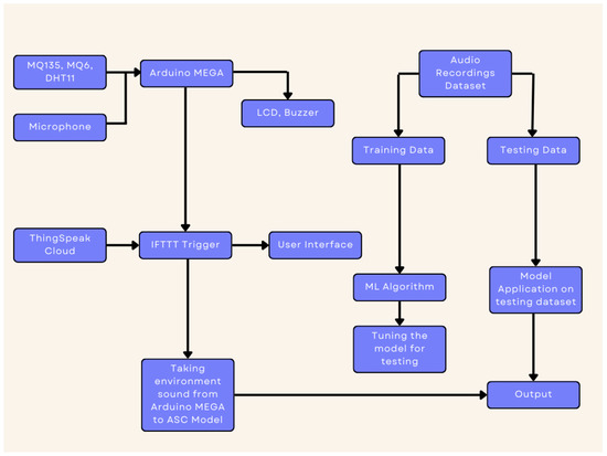 Based on these insights, our proposed system integrates widely available and reliable components like MQ135 and MQ6 sensors for air quality and gas detection, along with the DHT11 sensor for monitoring temperature and humidity. The use of an Arduino Mega ensures cost–effectiveness and compatibility with the sensors, while the leveraging of ThingSpeak for cloud integration addresses the need for real-time data visualization. Furthermore, the inclusion of a CNN-based acoustic scene classifier reflects advances in DL frameworks for sound recognition, inspired by studies leveraging spectrogram-based approaches [39,40].