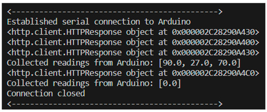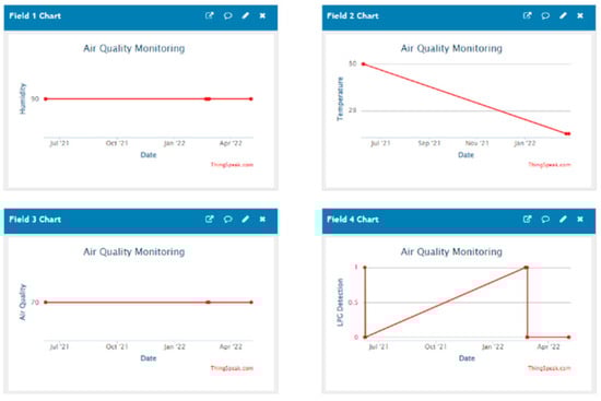 Another Python script plays a crucial role in ensuring seamless communication between the Arduino-based IoT device and the ThingSpeak cloud platform. Integrated with the Write API keys of the ThingSpeak channel, this script acts as a bridge, facilitating the transmission of real-time sensor data from the device to the cloud. To enable continuous monitoring and timely updates, this script is configured to run at regular intervals, typically every 20 s. This scheduling ensures that sensor readings from the Arduino are consistently captured and transmitted to the ThingSpeak channel without interruption. Once executed, this script initiates the data transmission process, packaging the sensor readings into structured data packets compatible with the ThingSpeak platform. These packets, containing air quality measurements, temperature, humidity, and gas detection status, are then sent over the internet to the designated ThingSpeak channel. Upon receiving the data, ThingSpeak processes and stores it in real time, allowing users to access up-to-date visualizations and analytics of their environment at any given moment. Through the ThingSpeak channel interface, users can view comprehensive graphs, charts, and statistics depicting environmental parameters, enabling them to gain valuable insights into their surroundings (Figure 7).