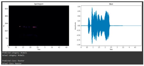 The ASC model underwent extensive testing to evaluate its ability to accurately classify environmental sounds. The testing process involved training the model on a diverse dataset and evaluating its performance using standard metrics such as accuracy, precision, recall, and F1 score. As explained above in Section 3.3, the dataset used for training and testing the ASC model comprised environmental sounds commonly encountered in everyday situations. The dataset was divided into five primary classes, each representing a different category of environmental sound. Within each class, there were 10 subclasses, each representing a specific type of sound within that category, as shown in Figure 2. To evaluate the performance of the ASC model, a separate validation dataset was used consisting of audio recordings not included in the training dataset. Figure 8 presents an example of the output prediction of the model from a random input from the testing set. The accuracy of the ASC model was measured by comparing the model’s predictions with the ground-truth labels for each audio recording in the validation dataset. The accuracy metric represents the percentage of correctly classified audio recordings out of the total number of recordings in the validation dataset. After successfully training and testing the ASC model, an accuracy of 96% was achieved. This accuracy metric indicates that the model correctly classified 96% of the audio recordings in the validation dataset, as shown in Figure 9a,b. Additionally, precision (0.95), recall (0.94), and F1 score (0.945) metrics were calculated to provide a more comprehensive evaluation of the model’s performance.