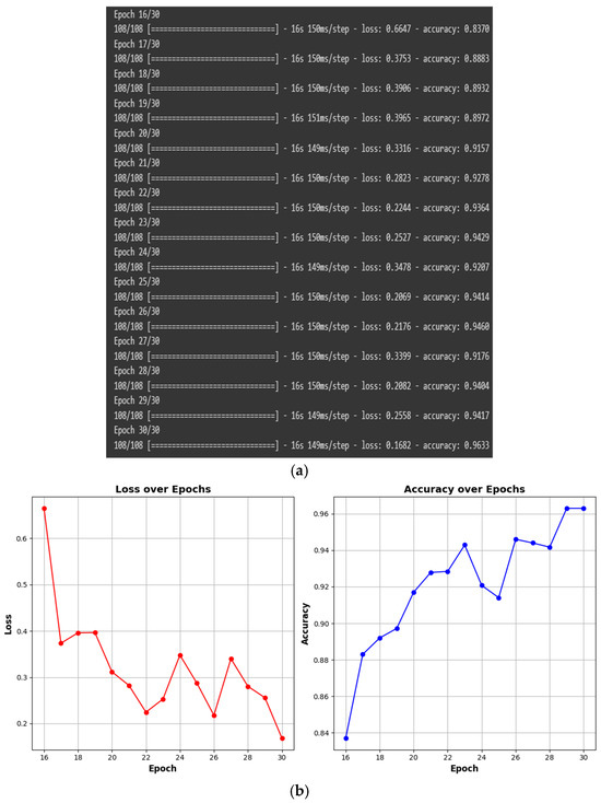 (a) Accuracy at the end of 30 epochs for the testing dataset (b) Plot representation of accuracy and loss over epochs.