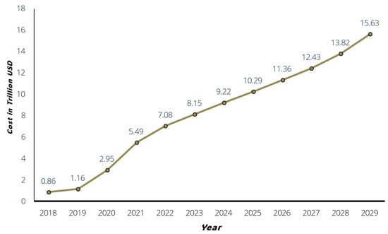 Globally, the situation has worsened in recent years. As mentioned in the global financial stability report, cyberattacks have been increasing drastically in recent years, and the share of the financial and insurance sector has doubled in the past decade [8]. The reason for this be could be the continuous increase in the use of AI and other advanced technologies [8]. Similarly, the cost of these attacks is also expected to increase. Figure 1 illustrates the cost of global cybercrime.
