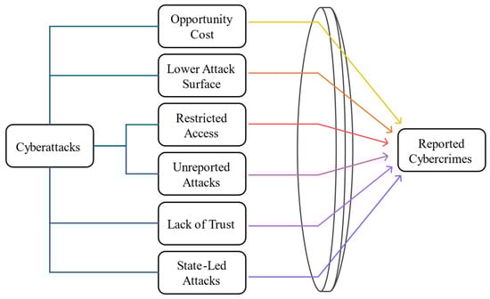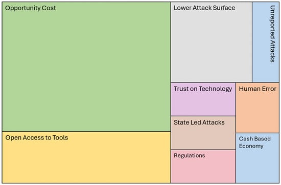 Opportunity cost is the most prominent factor identified and supported by a sizable number of cybersecurity experts. Experts suggest that the financial data of developing countries are not highly valued in the international market and that the developing market is not lucrative for threat actors. The threat actor compares the cyberattack’s required costs and gains [34]. The decision to attack is based on a cost-and-benefit comparison [35]. Hence, regions with higher opportunity costs may face lower cyberattacks.