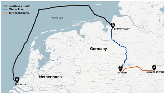 There is a lack of studies explicitly dedicated to reviewing the literature on ETA prediction within waterway networks, encompassing both sea and inland routes. Sea waterways, such as the North Sea routes, are large bodies of salt water that connect continents and countries, and are typically deeper and wider than inland waterways. Inland waterways, which include rivers, canals, and lakes within a country or between neighboring countries, are generally smaller and shallower. They can be divided into natural inland waterways, such as the river Rhine or the river Weser, and artificial waterways, such as the Mittellandkanal, which have been constructed to improve navigability or provide logistical shortcuts. Figure 1 shows a North Sea route through which a ship can travel from the Bremerhaven port in Germany to the Rotterdam port in the Netherlands. Additionally, in the same figure, a ship can travel from Braunschweig to Minden via the artificial waterway the Mittellandkanal, and then from Minden to Bremerhaven through the natural inland waterway river Weser. Dobrkovic et al. [2], who analyzed existing methods and algorithms for predicting maritime routes using Automatic Identification System (AIS) data from 2004 to 2015, did not focus specifically on ETA. This study categorized the publications according to three prediction objectives (trajectory, arrival time, and route variation), prediction methods, timeframe, accuracy, and data quality. The study presented here makes a noteworthy contribution compared to the previously mentioned paper for the following reasons: