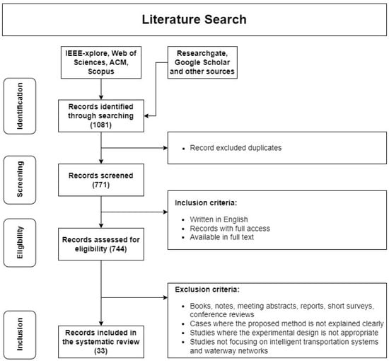 A comprehensive search was conducted across several databases, including IEEE Xplore, ACM Digital Library, Scopus, and Web of Science, to identify relevant studies. These databases appeared to be relevant and comprehensive for ITS research. The search included journal articles and conference proceedings from 2011 to 2023. A list of key terms and their synonyms, such as “arrival time”, “journey time”, “travel time”, “ETA”, “ship”, “vessel”, etc., was compiled. These terms were used to create inclusive and relevant queries through several iterations. Boolean operators “OR” (to include synonyms and alternative terms) and “AND” (to link different search terms) were used in the search query. The search query for this study is as follows: ((“travel time” OR “journey time” OR “arrival time” OR “time of arrival” OR “eta” OR “estimate* time”) AND (“predict*” OR “estimate*” OR “forecast*”) AND (“ship*” OR “vessel*” OR “voyage”)).