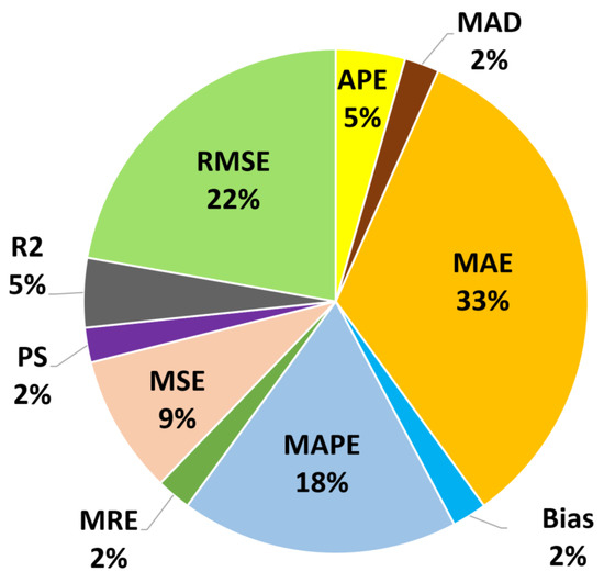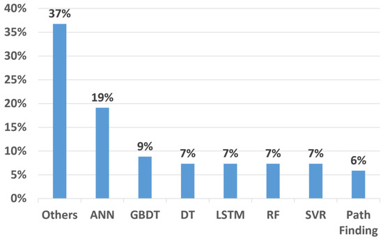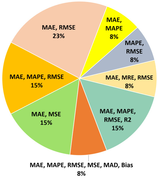 Figure 7 and Figure 8 illustrate the extent to which each metric is used, both individually and in combination (a combination of several metrics). Figure 7 illustrates the frequency of use of the metrics considered in this study: MAE (33%), RMSE (22%), MAPE (18%), MSE (5%), APE (5%), and R2 (5%). Figure 8 shows the distribution percentages of various combined metrics used in the evaluation. The analysis indicates that the most frequently employed evaluation metric combinations are as follows: MAE and RMSE (23%); MAE, MAPE, and RMSE (15%); MAE, MAPE, RMSE, and R2 (15%); and MAE and MSE (15%). Therefore, the use of MAE, RMSE, and MAPE together as evaluation metrics for the ETA model allows for achieving a level of the best possible results for the methods described in the reviewed papers.