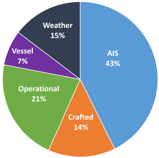In addition, the utilization rate of factors is shown and outlined by the five primary categories AIS factors (AFs), vessel factors (VFs), weather factors (WFs), crafted factors (CFs), and operational factors (OFs). The existing literature shows that ship positional data with timestamps from AIS data sources are the main factors for ETA prediction. These three factors are the base factors, while the rest of the AFs, VFs, WFs, CFs, and OFs can be blended when modeling ETA prediction. Apart from these three base factors, the rest of the AFs are recognized as the most used factors for ETA in the existing literature (Figure 5). Figure 5 shows that the frequency of use of AFs, VFs, WFs, CFs, and OFs in ETA techniques is 43%, 7%, 15%, 14%, and 21%, respectively. Furthermore, as shown in Figure 6, SOG, manually inputted AIS ETA, heading, COG, length, vessel type, and draught are the most frequently used factors in ETA models. Moreover, AIS factors are usually combined with all other factors. A frequent combination of an AIS factor is with crafted and operational factors, both securing 33% and 33%, respectively. Additionally, researchers have combined AIS factors with vessel factors and weather factors at rates of 15% and 19%, respectively.