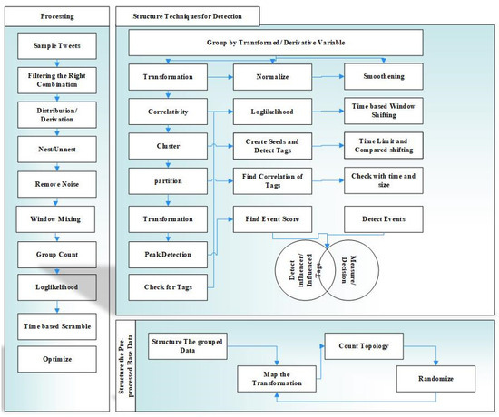 Furthermore, our framework allows comparative analyses because it provides well-defined standards, which allowed us to compare various techniques for event detection under the same conditions. The contribution of this work is the development of a general methodology oriented toward scalability, flexibility in real time, and variety within the domain, taking the best from previous contributions [3,6,24]. This rigorous methodology covers the existing gaps but also paves the way for future investigations into the area of event detection systems based on X data streams. The following sections will first describe and assess the methodologies provided in previous publications on event detection strategies. Second, we offer accessible cooperation strategies for evaluating event detection algorithms.