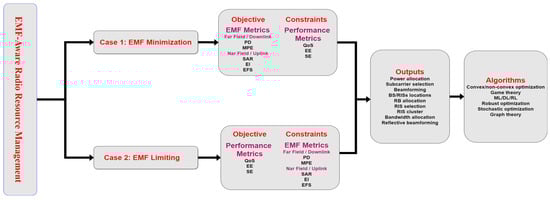 - This paper enhances our understanding of EMF-aware radio resource management for 5G and beyond by synthesizing recent strategies that incorporate EMF constraints into resource allocation. It examines techniques such as power control, beamforming, subcarrier allocation, and user association to balance network performance and EMF safety, with a focus on the dynamic role of RIS technology in reshaping EMF patterns to minimize exposure.